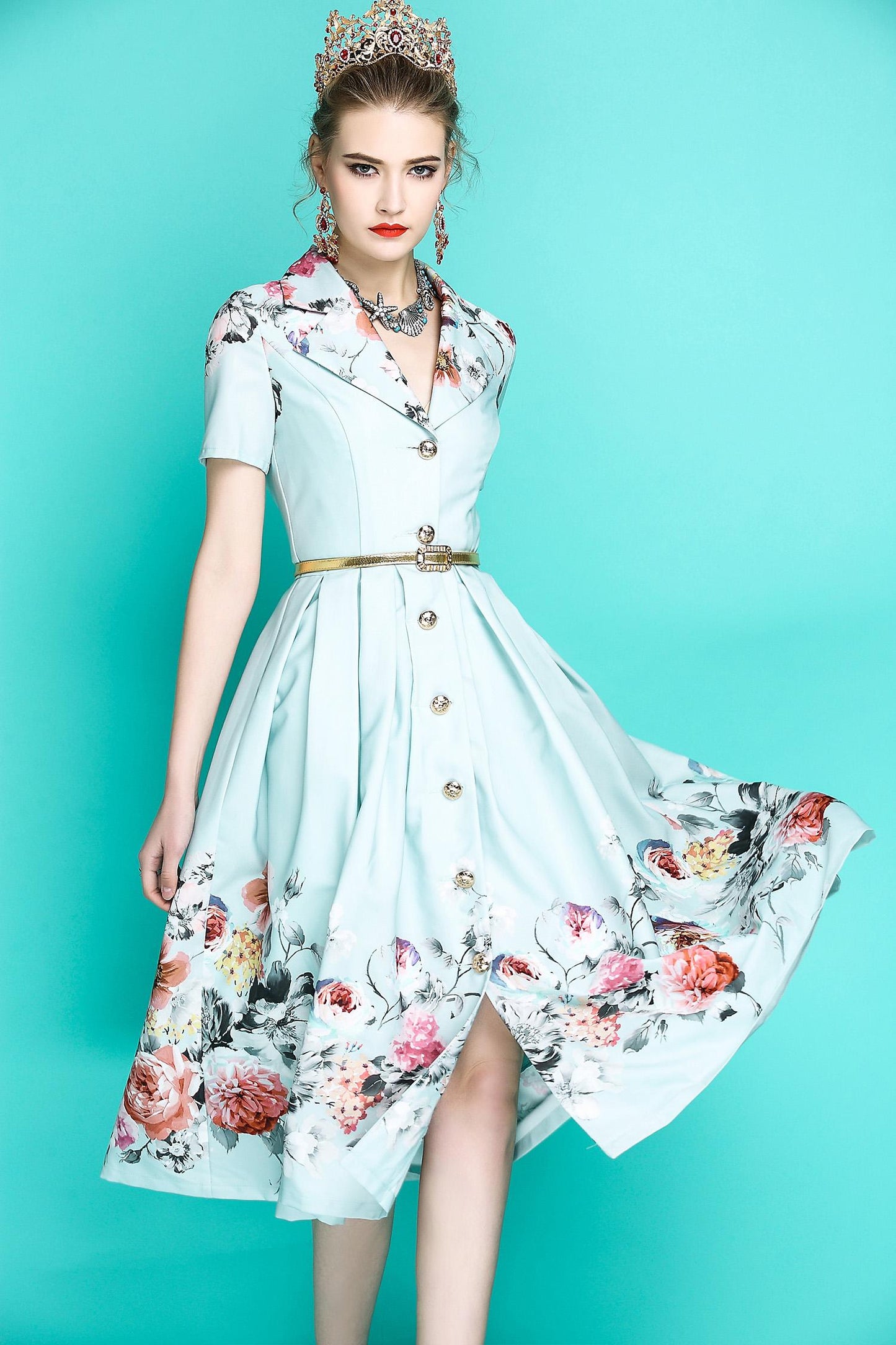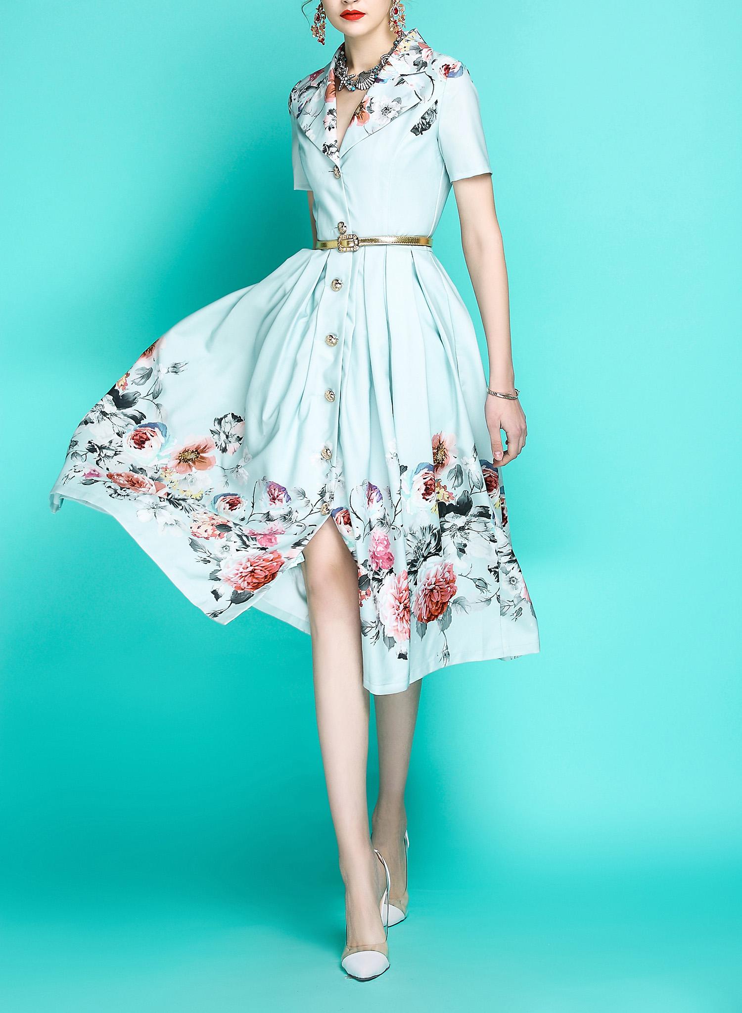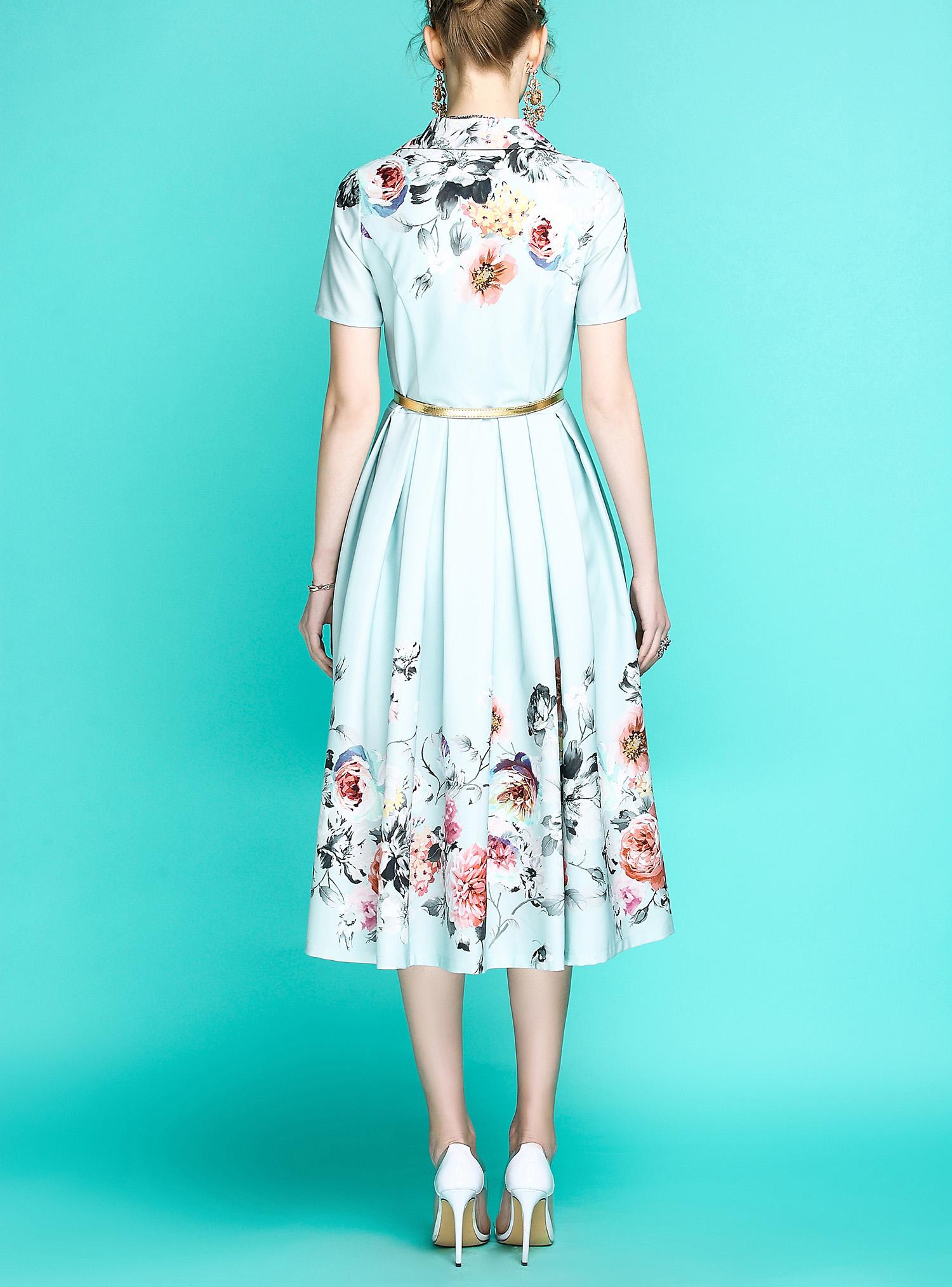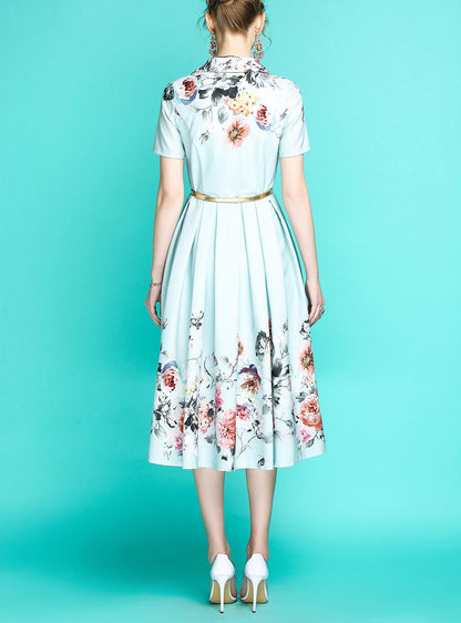 Audrey Hepburn inspired retro light blue pastel blue floral printed short sleeve 1950's inspired midi full swing dress - Roman