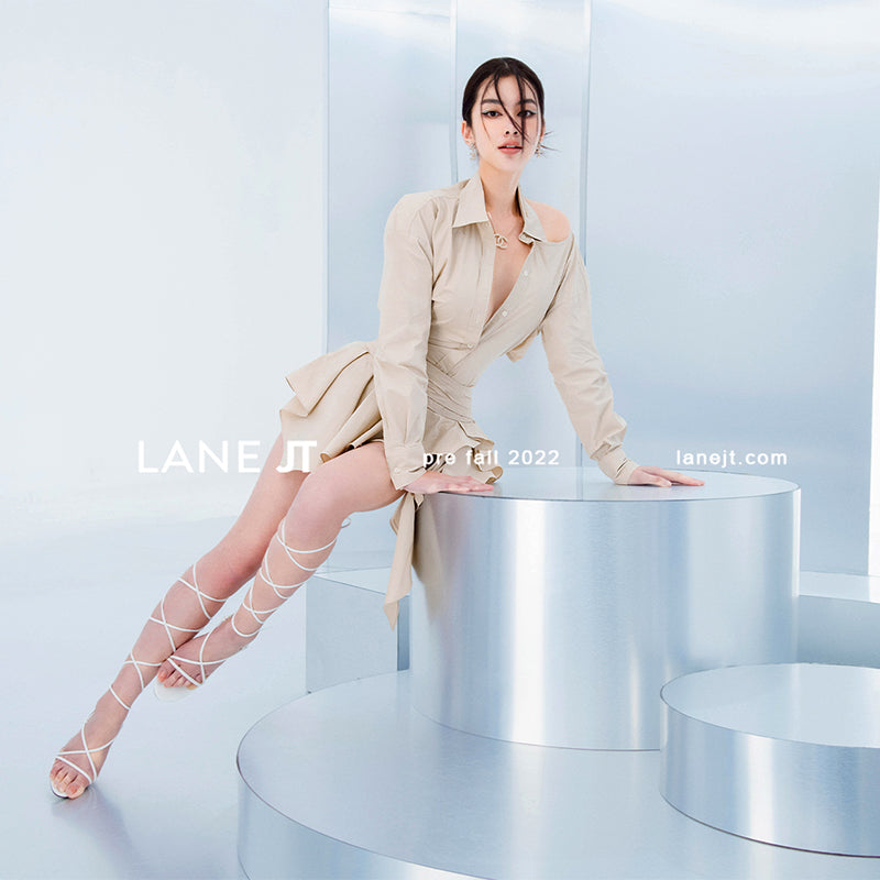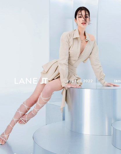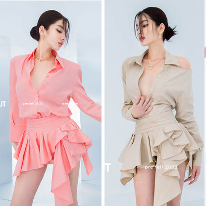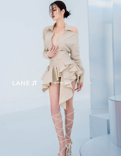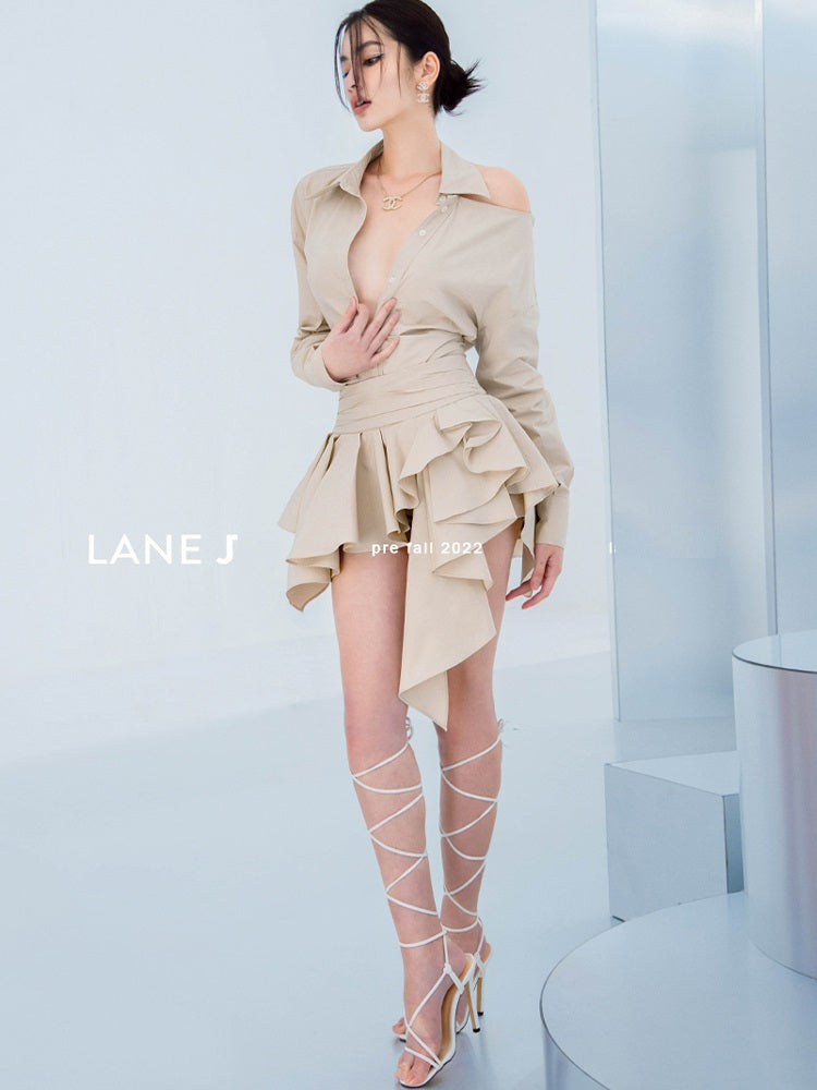 Beige Autumn new long-sleeved ruffled waist up and down suits- Delia