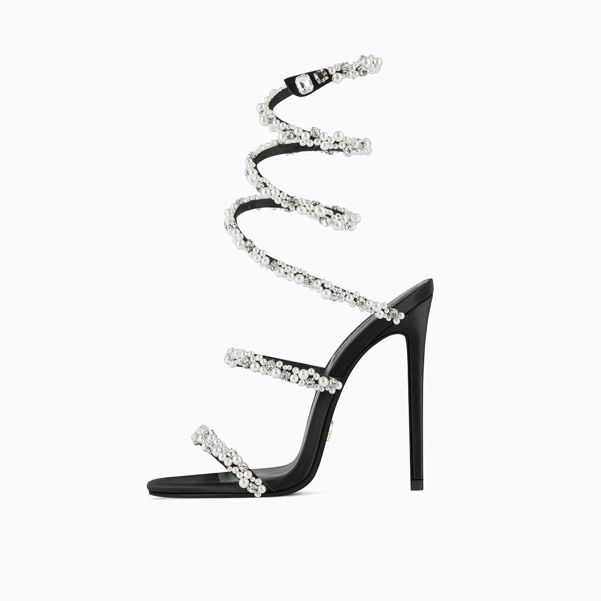 Black pearl rhinestone ankle scoil sexy open toe high heels stiletto sandals - Nooi