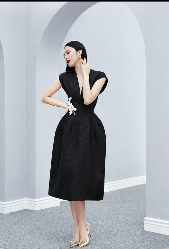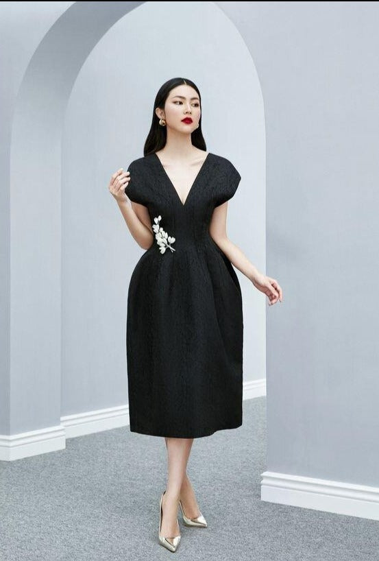 DIAMONDE V-NECK MIDI LBD BLACK DRESS- Poliana