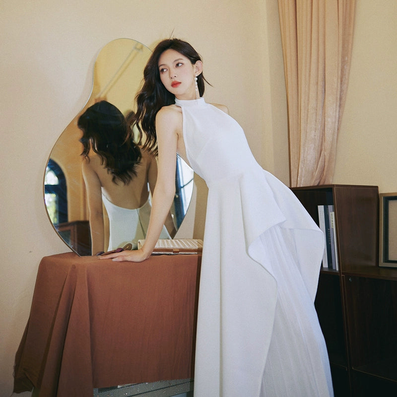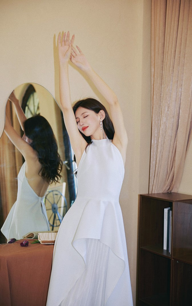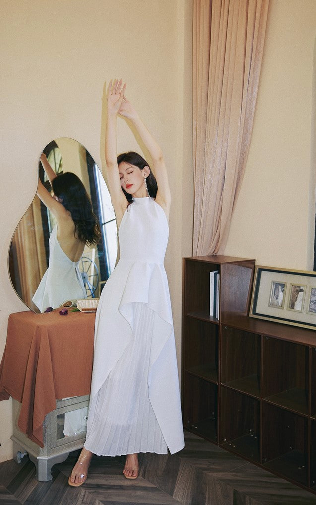 DOLLY High End White/Black Sleeveless Ruffled Halter Neck Top+ Pleated Skirt-SOLANGE