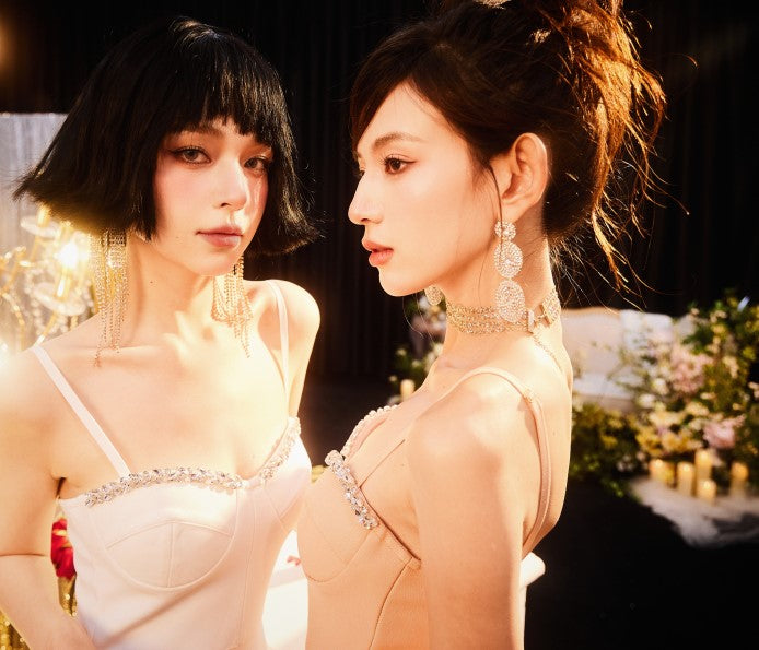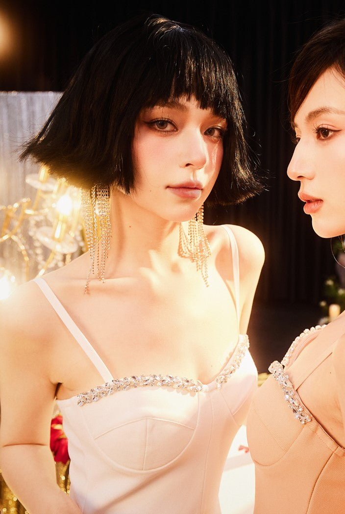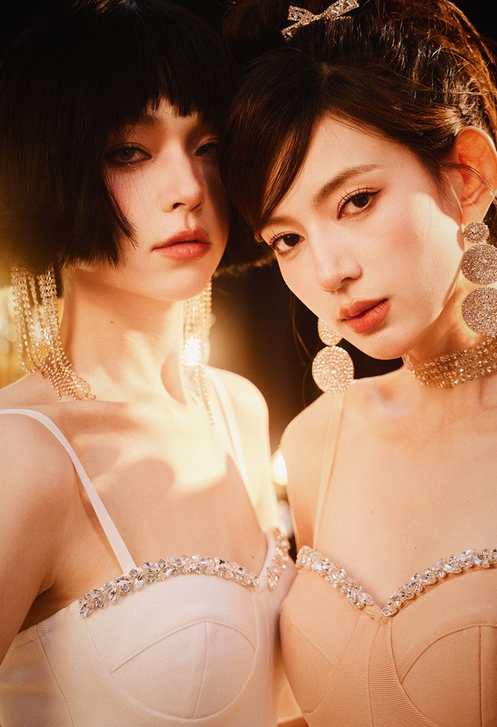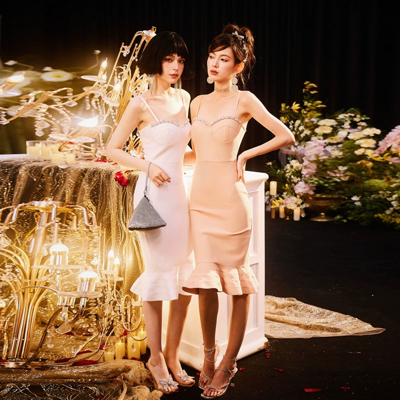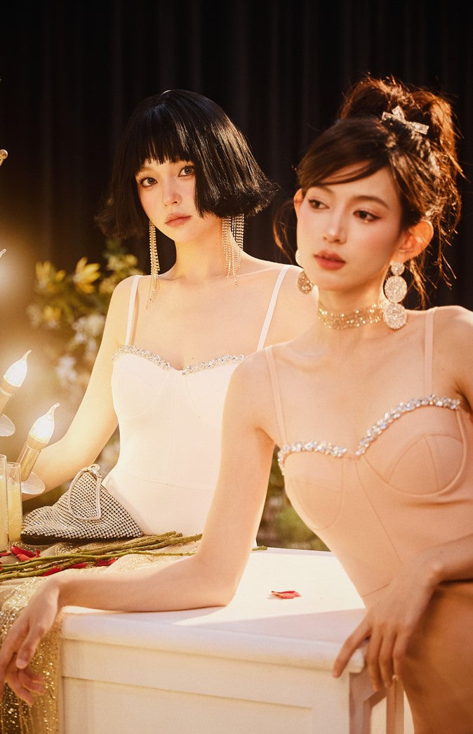 DOLLY High End White/Nude Sleeveless Diamond Fish Tail Suspender Dress-JABEL
