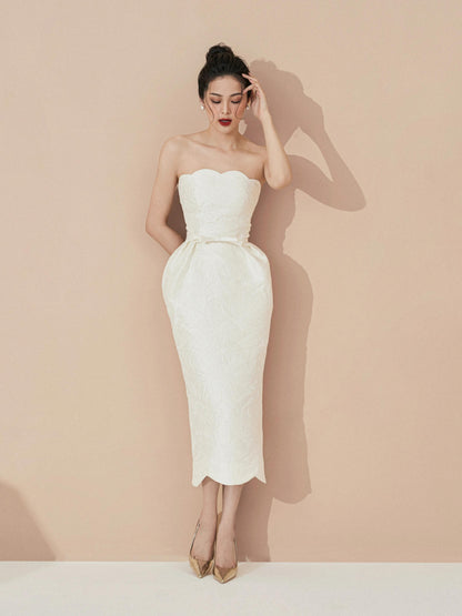 Engraved petal strapless midi pencil scallop hem belle petal midi dress - SURAYA