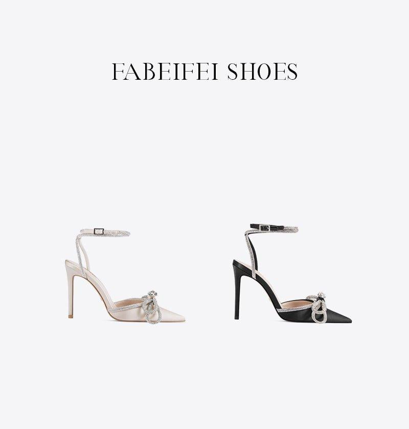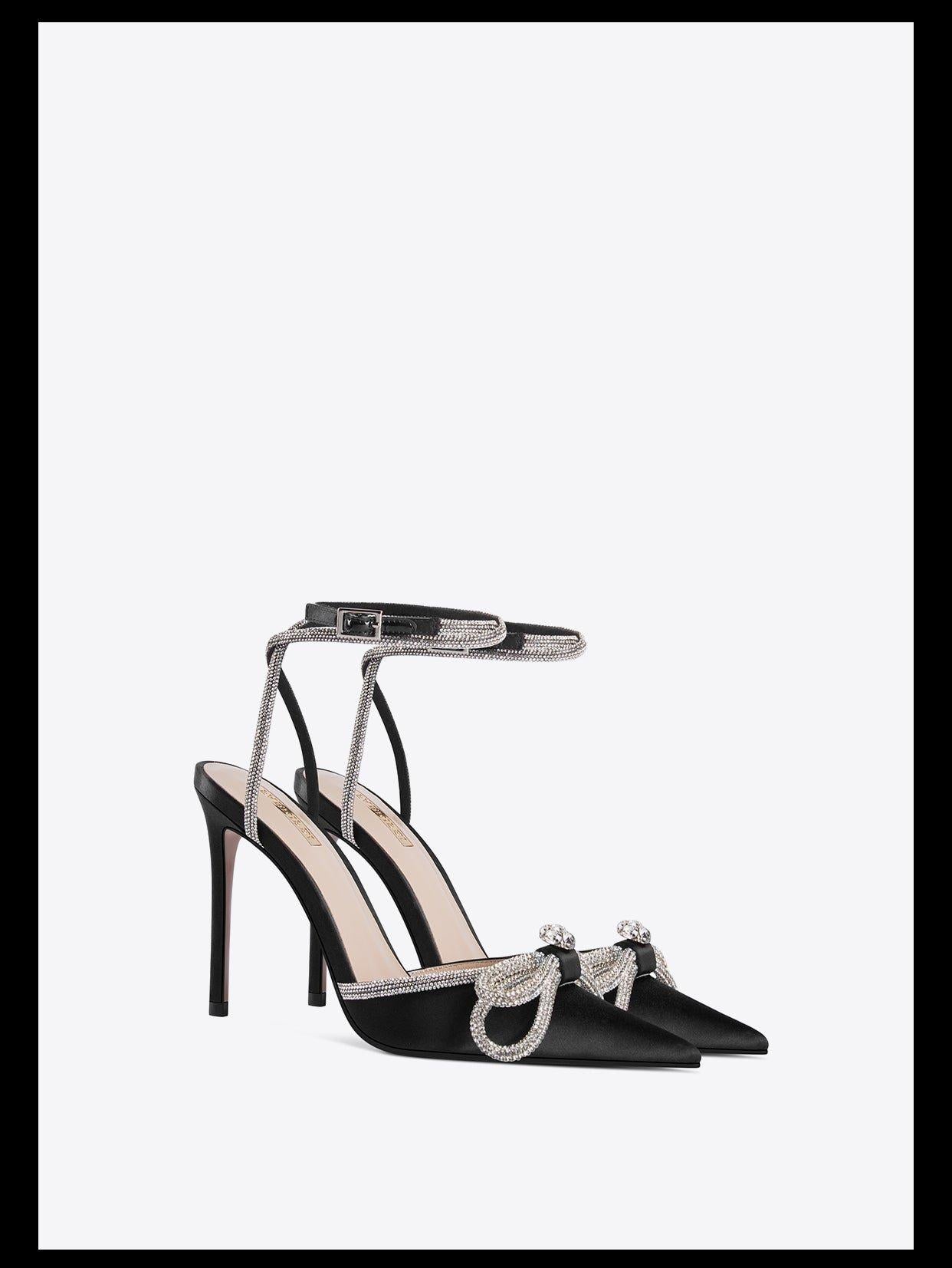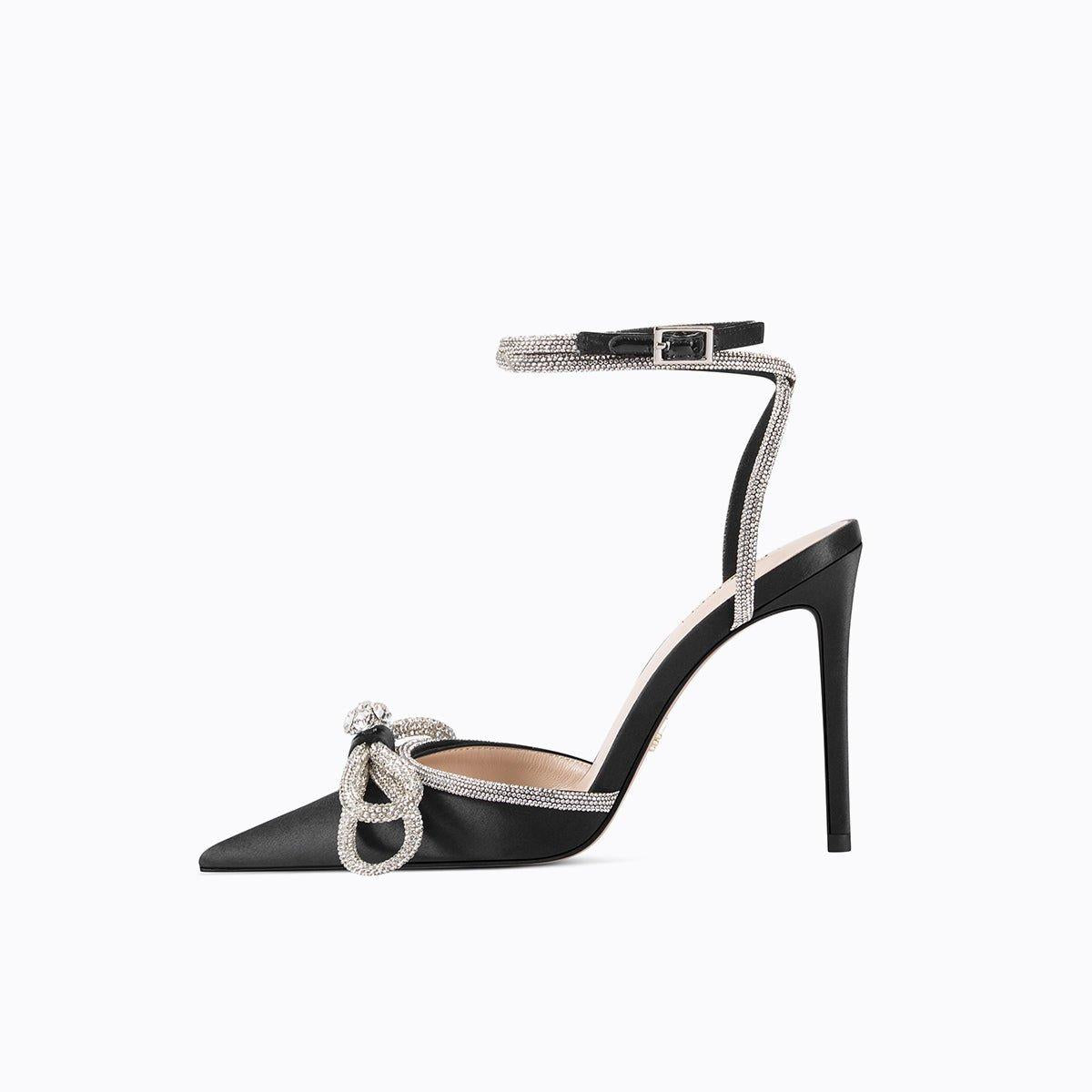 Black pointed toe rhinestone bow stiletto high heel buckle strap - Trriu