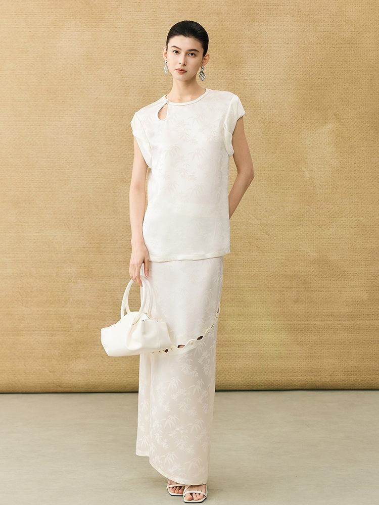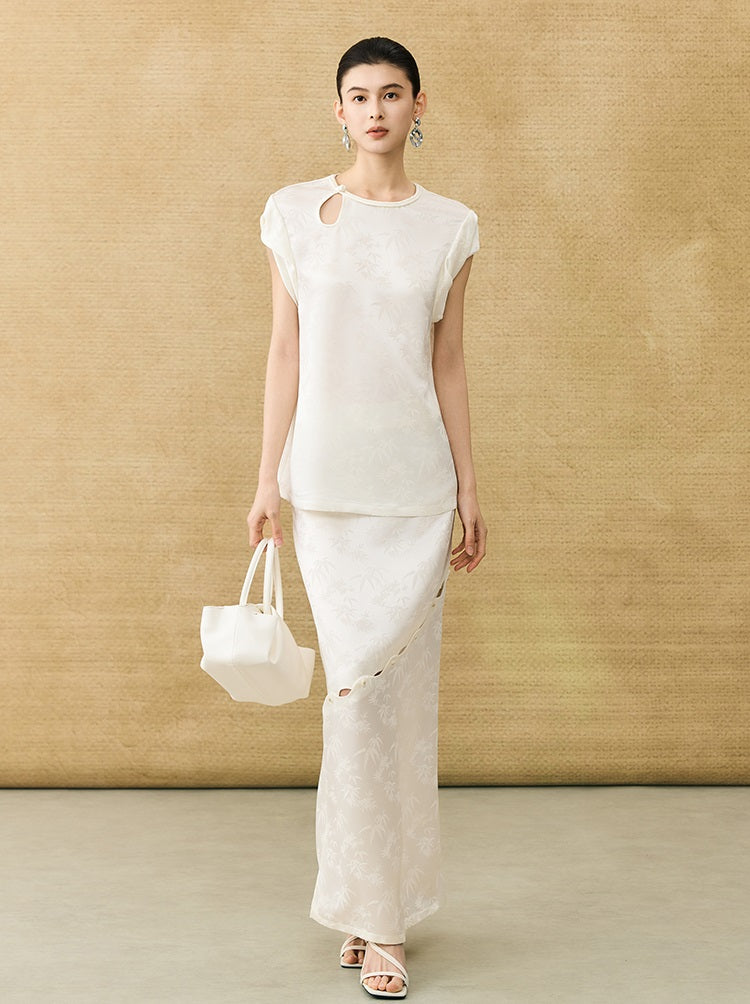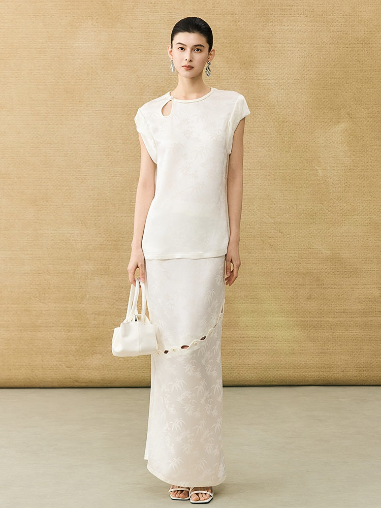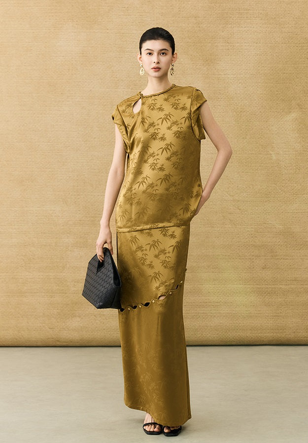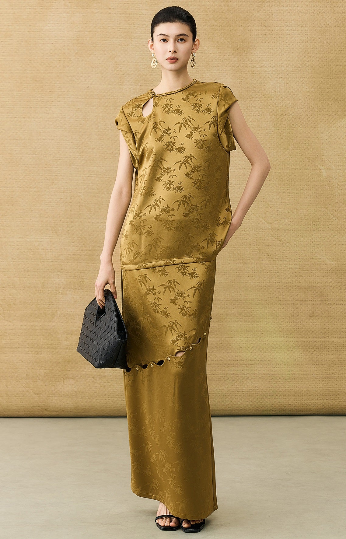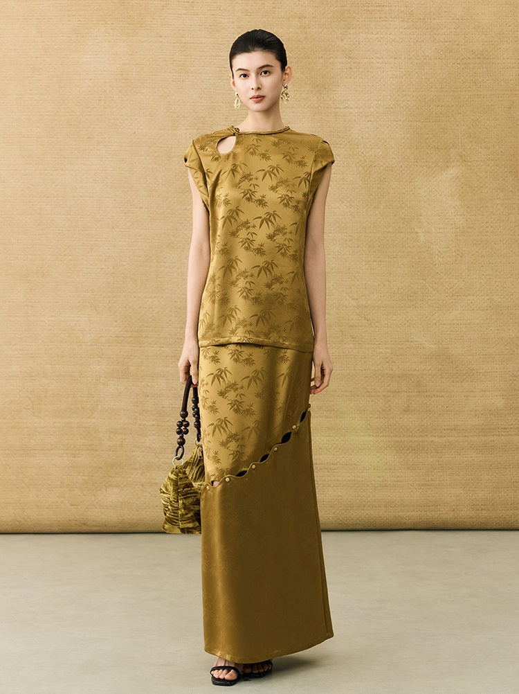 This HECO Chinese Acetate Fugui Buckle T-shirt features a sophisticated round neck design with stylish cut-out details, creating a modern and breathable look. Its sleeveless cut enhances comfort and freedom of movement, making it ideal for warm weather or layering. Crafted from high-quality acetate, it offers a smooth, lightweight feel with subtle sheen, combining traditional influences with contemporary fashion for an effortlessly refined appearance.