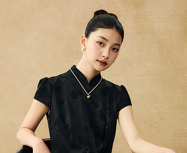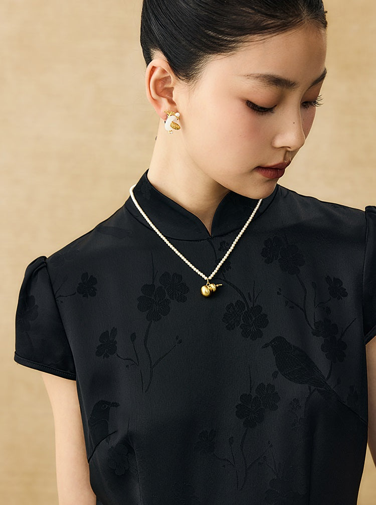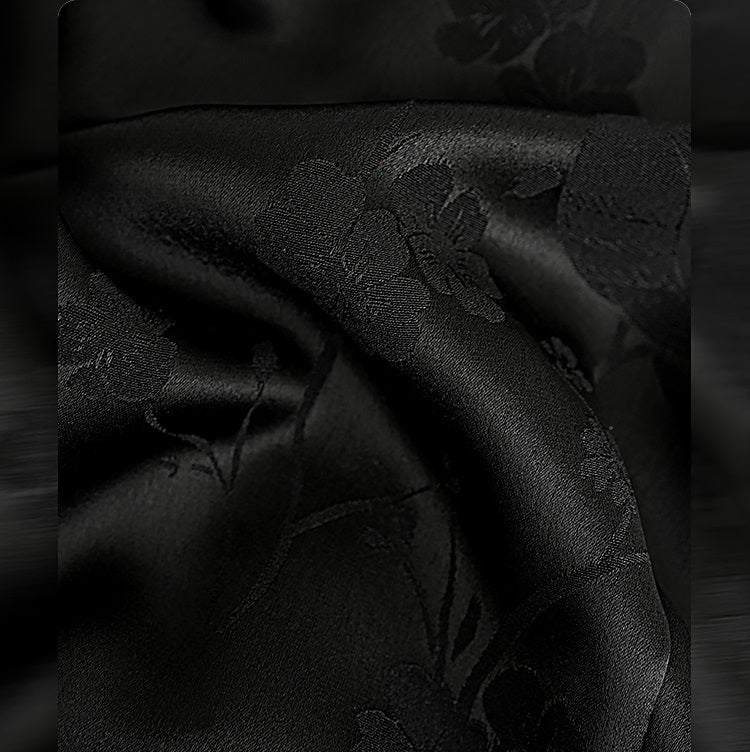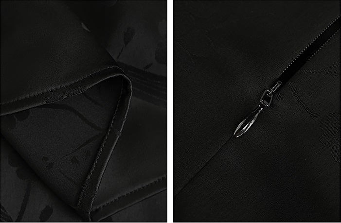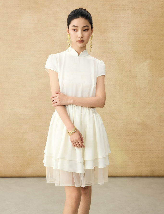 This dress combines a fitted bodice with a tiered, ruffled skirt, creating a modern interpretation of a classic silhouette. It features a high, structured collar and very short cap sleeves for a refined look. The fabric showcases a subtle woven jacquard pattern of birds and flowers, adding intricate elegance. A sheer black mesh layer at the skirt’s hem enhances the ruffled texture, delivering both dimension and sophistication. Perfect for those seeking a timeless style with contemporary, delicate details.