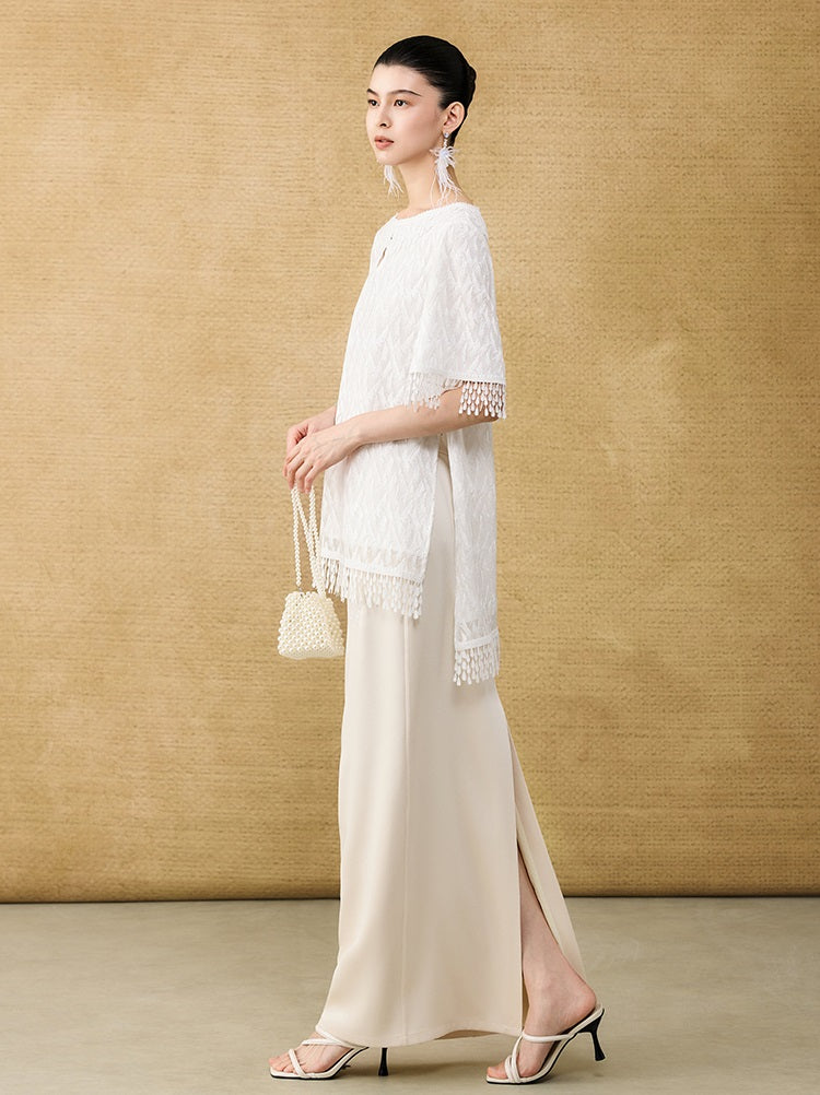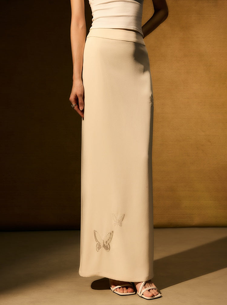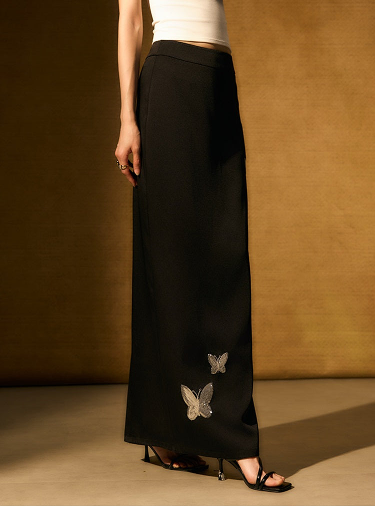 This slimming straight skirt features intricate Chinese butterfly bead embroidery, adding a refined and artistic touch. Crafted with precision, it includes a subtle slit at the back for ease of movement and a sleek silhouette. Ideal for a polished, elegant look with an expert-tailored fit.