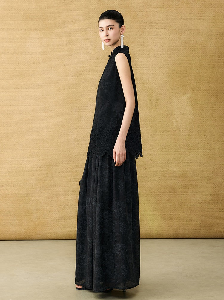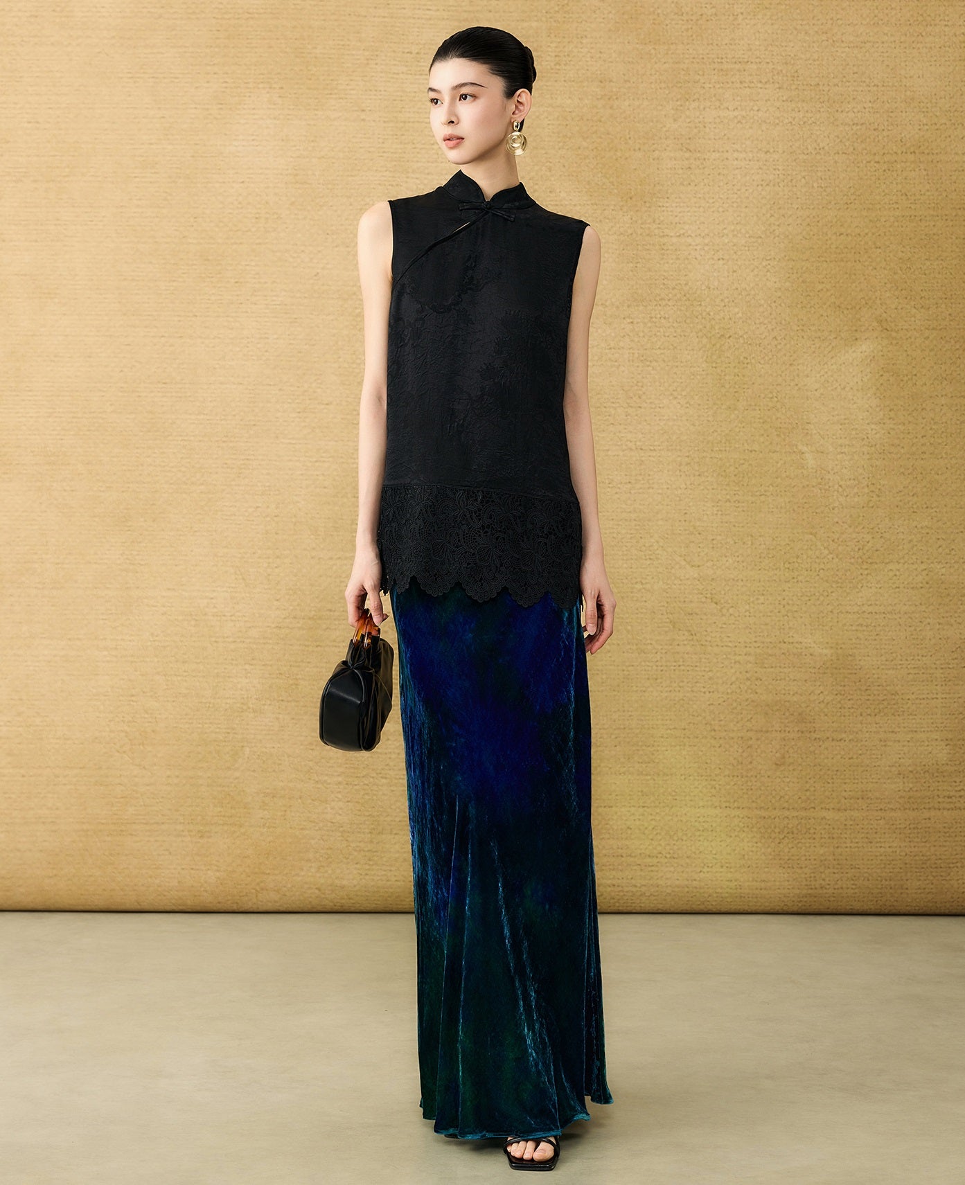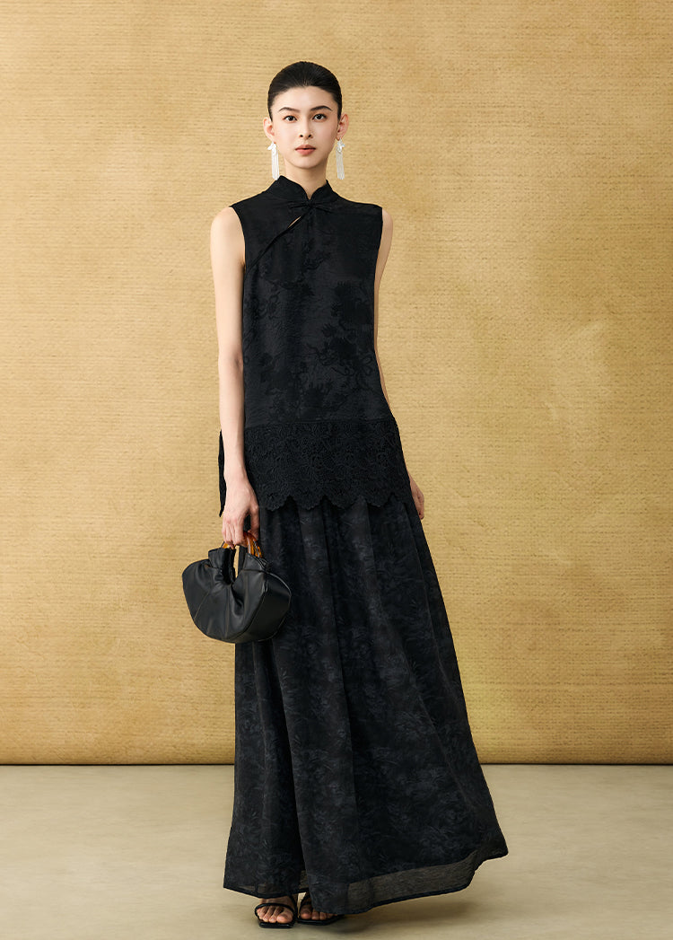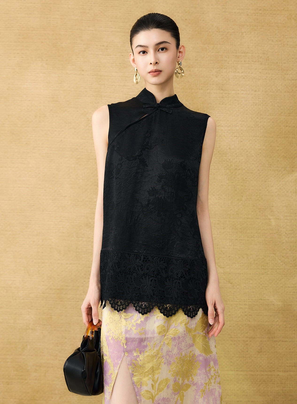 This sleeveless jacquard top features a mandarin neckline and a delicate lace hem, combining traditional elegance with modern design. The diagonal placket with buckle detail adds a subtle touch of sophistication, making it a refined choice for warm weather or layered styling.