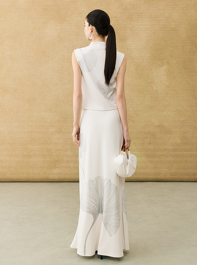 This sophisticated summer set features a sleeveless draped neck top paired with a long A-line skirt, both adorned with an elegant ginkgo leaf print. The flowing silhouette balances comfort and style, making it ideal for warm weather while offering a timeless, refined look. Perfect for those seeking a graceful yet modern outfit that highlights expert craftsmanship and subtle botanical charm.