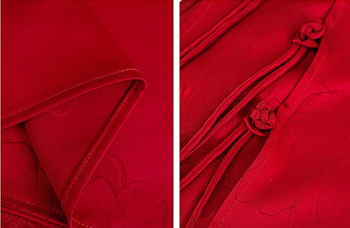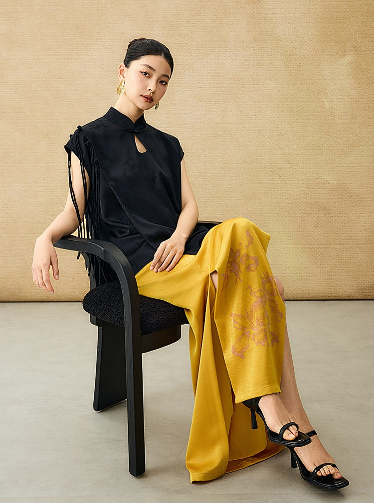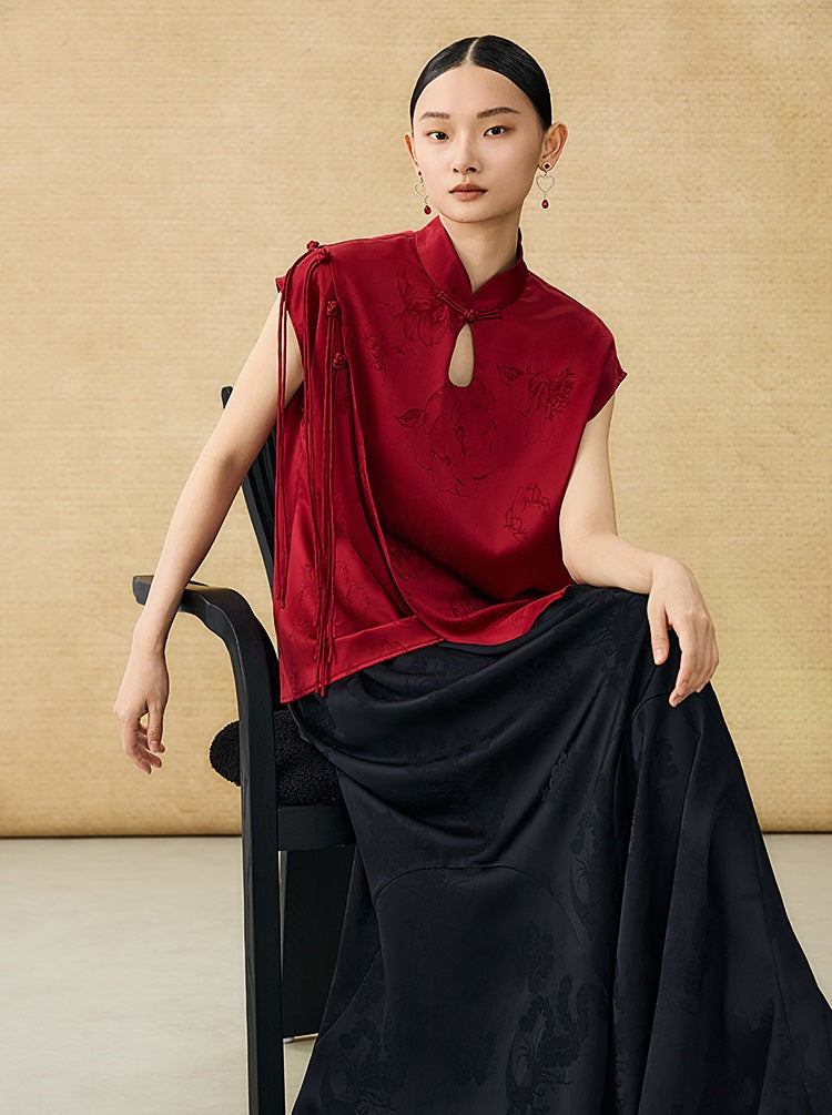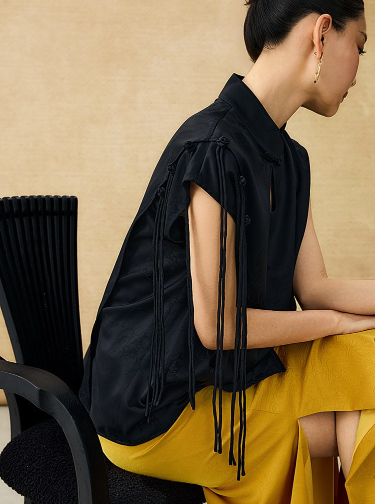 This sophisticated top features a mandarin neckline with a tasteful chest cutout, offering a modern twist on classic design. Crafted without sleeves for a clean silhouette, it’s accented by elegant shoulder fringe that adds movement and texture. The acetate fabric provides a smooth, polished finish, making it ideal for stylish, refined looks. Perfect for those seeking a distinctive statement piece with subtle cultural elements.