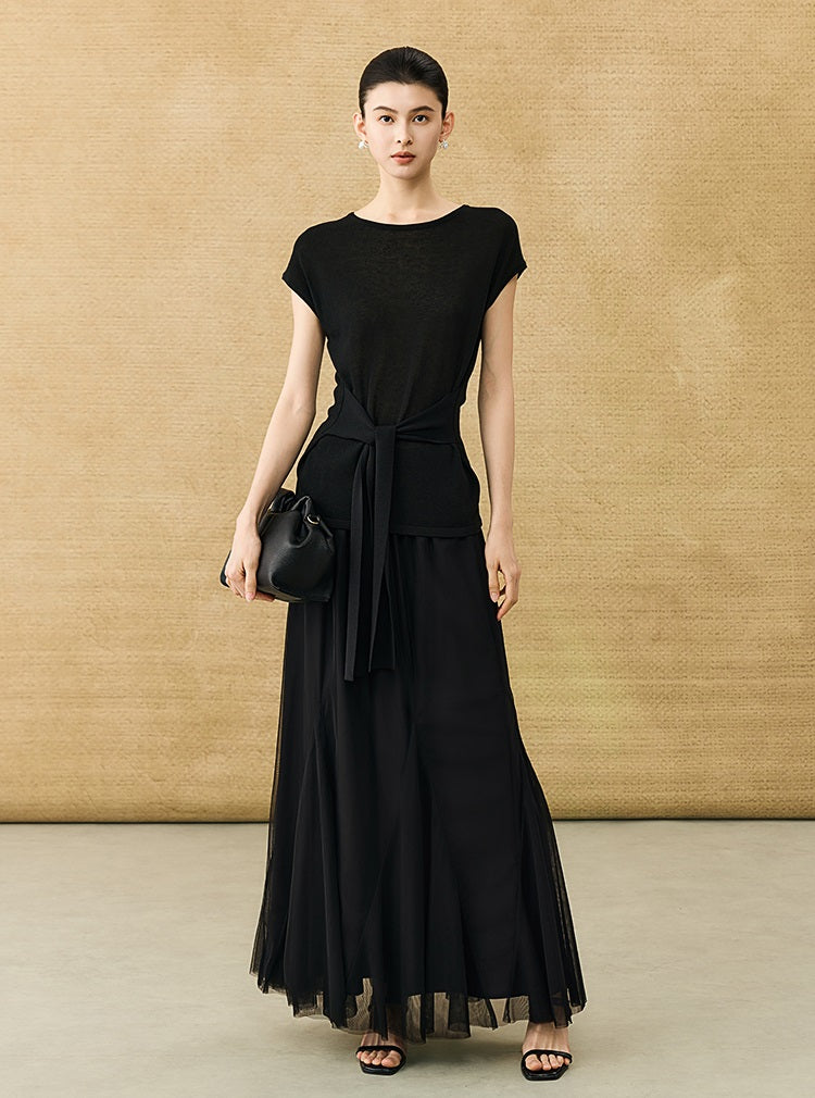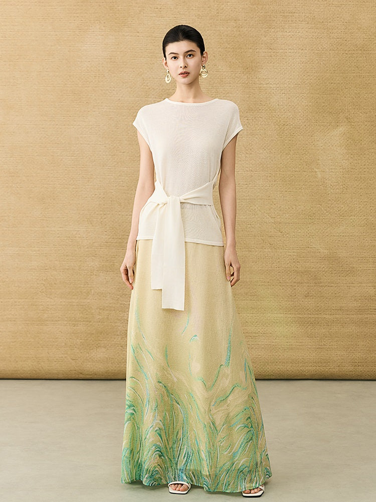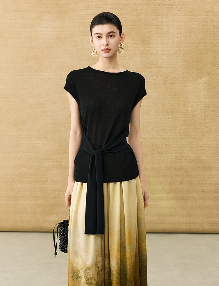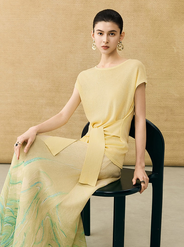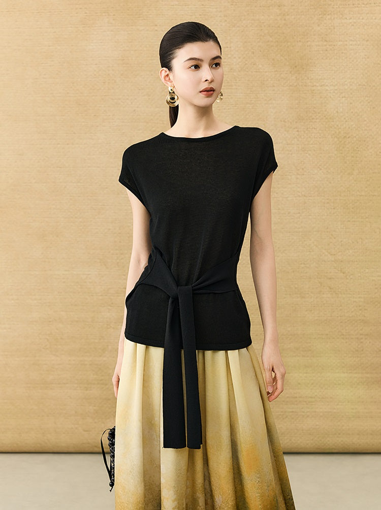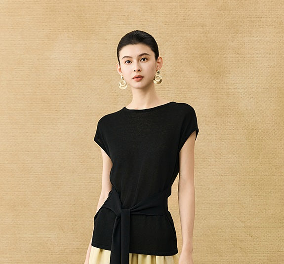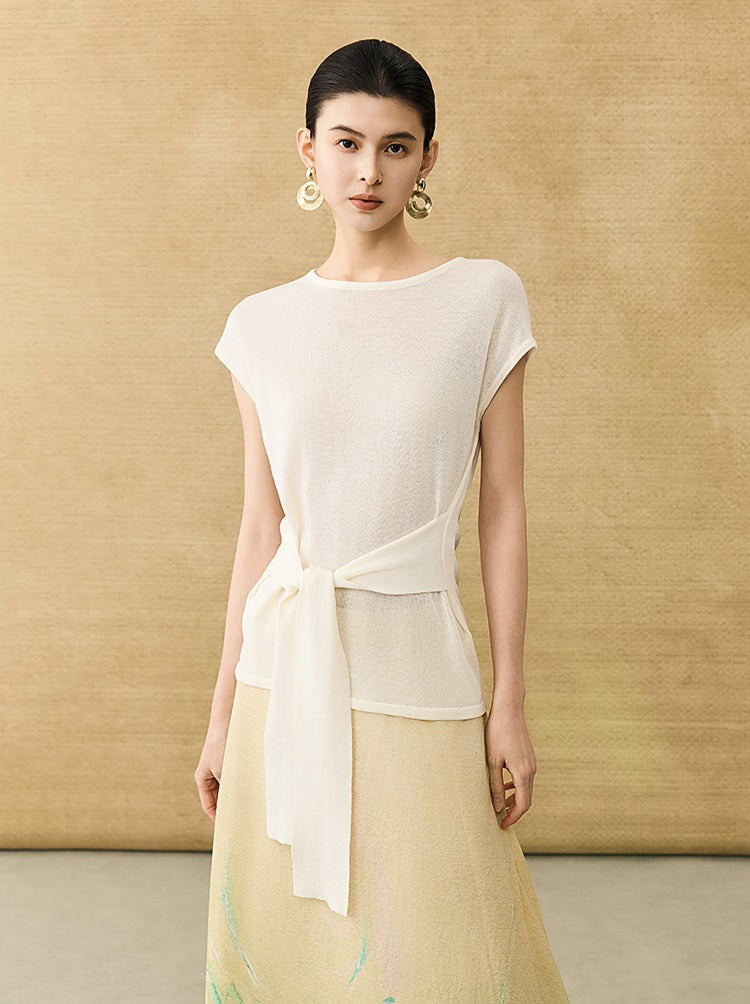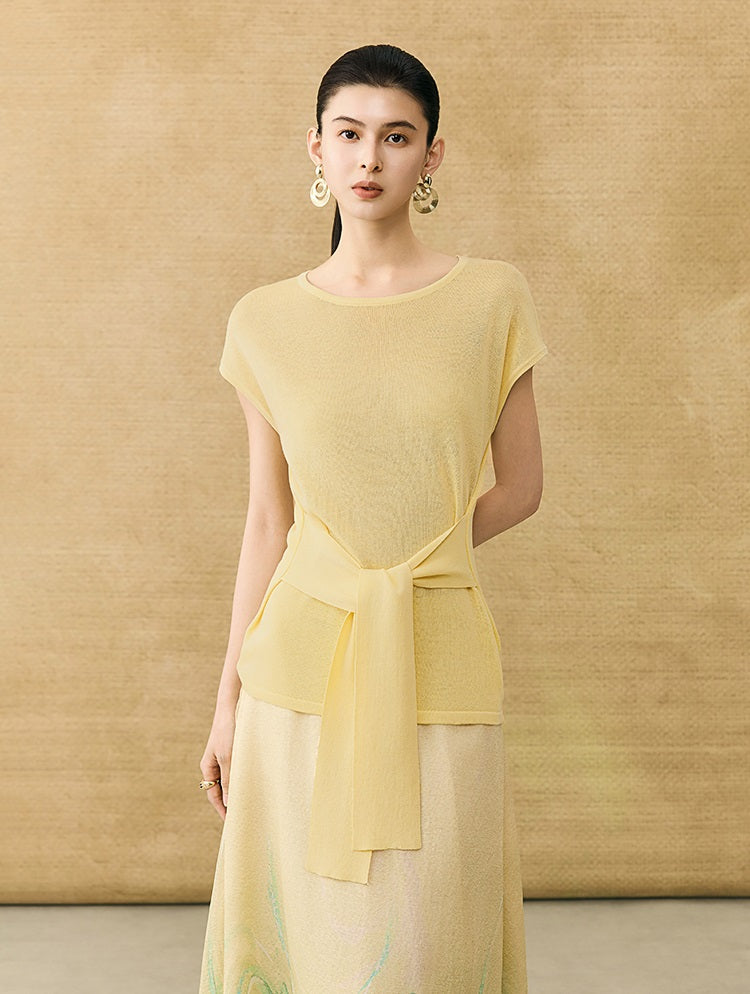 This breathable linen knit T-shirt features a classic crew neck and short sleeves for comfortable, everyday wear. The slim-fitting design is enhanced by a self-tie belt at the waist, allowing for a customizable fit that flatters your silhouette with subtle elegance.