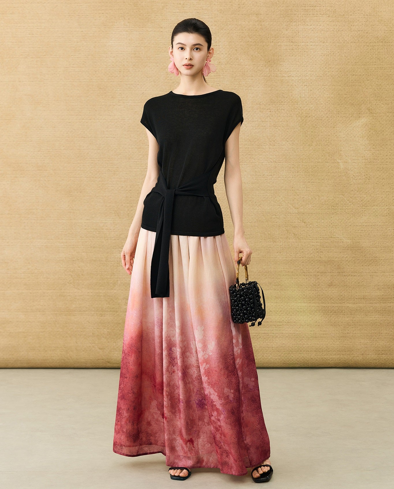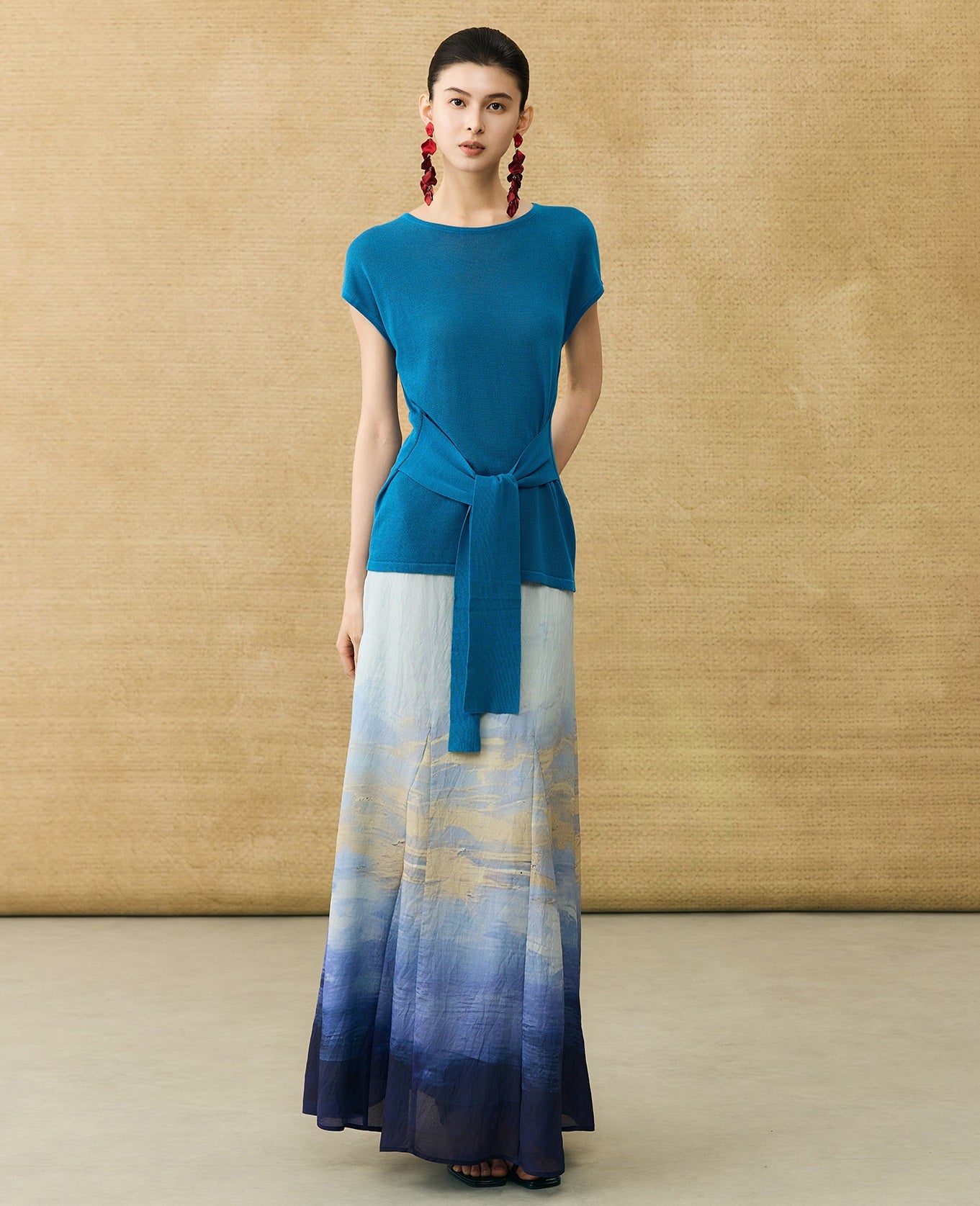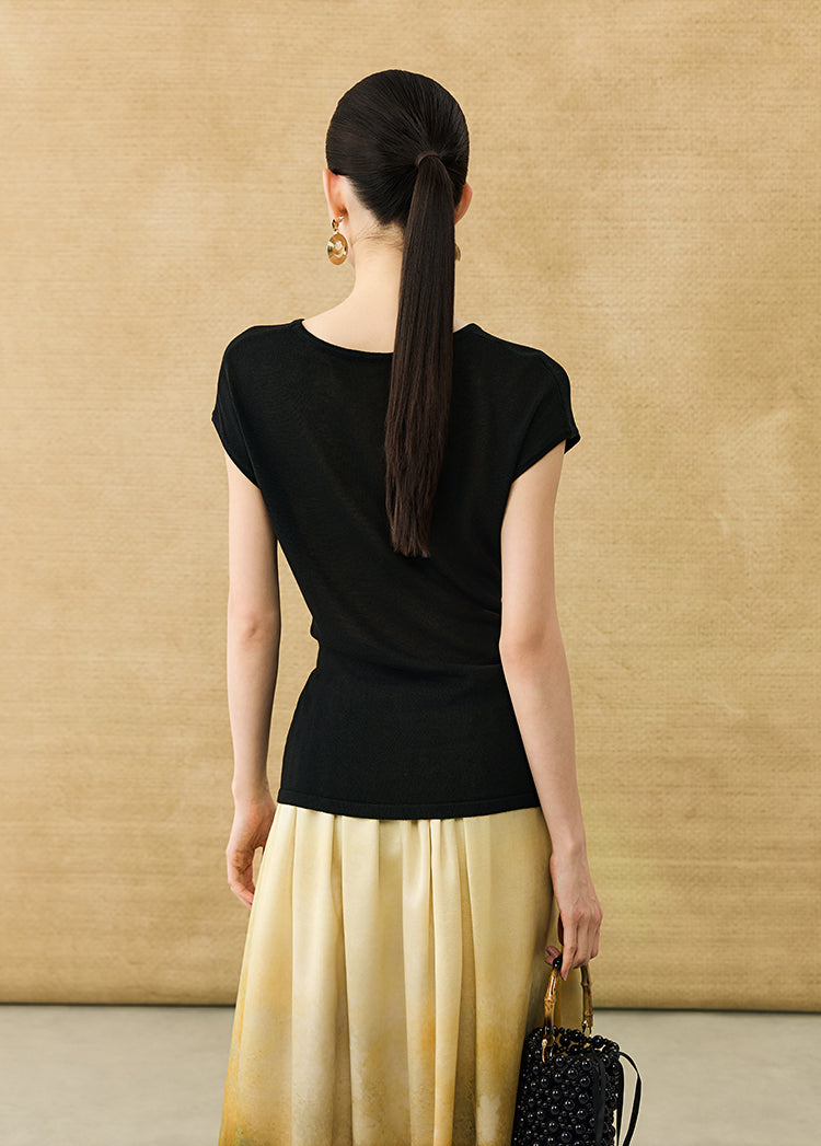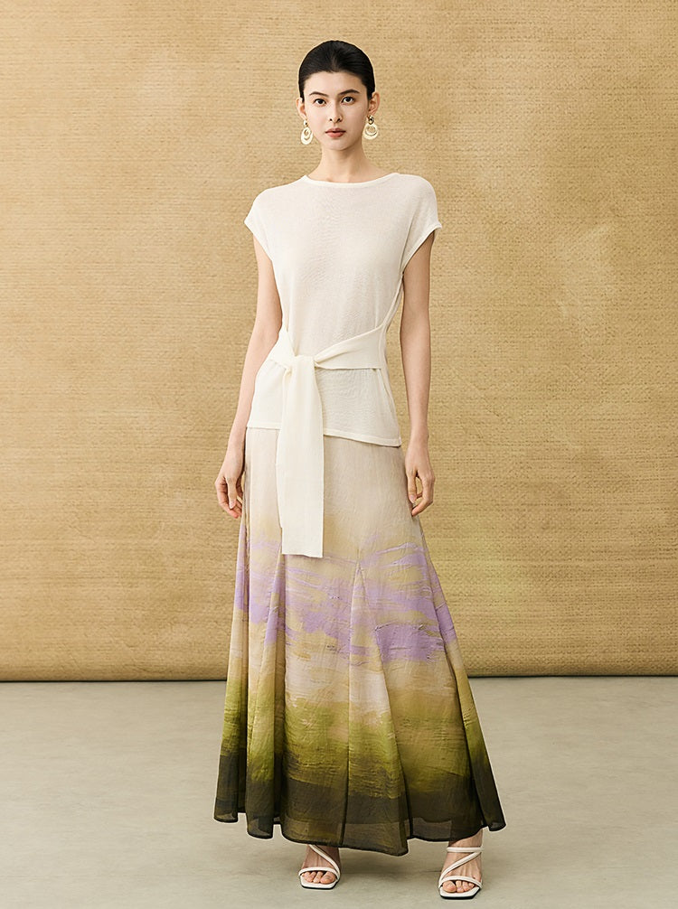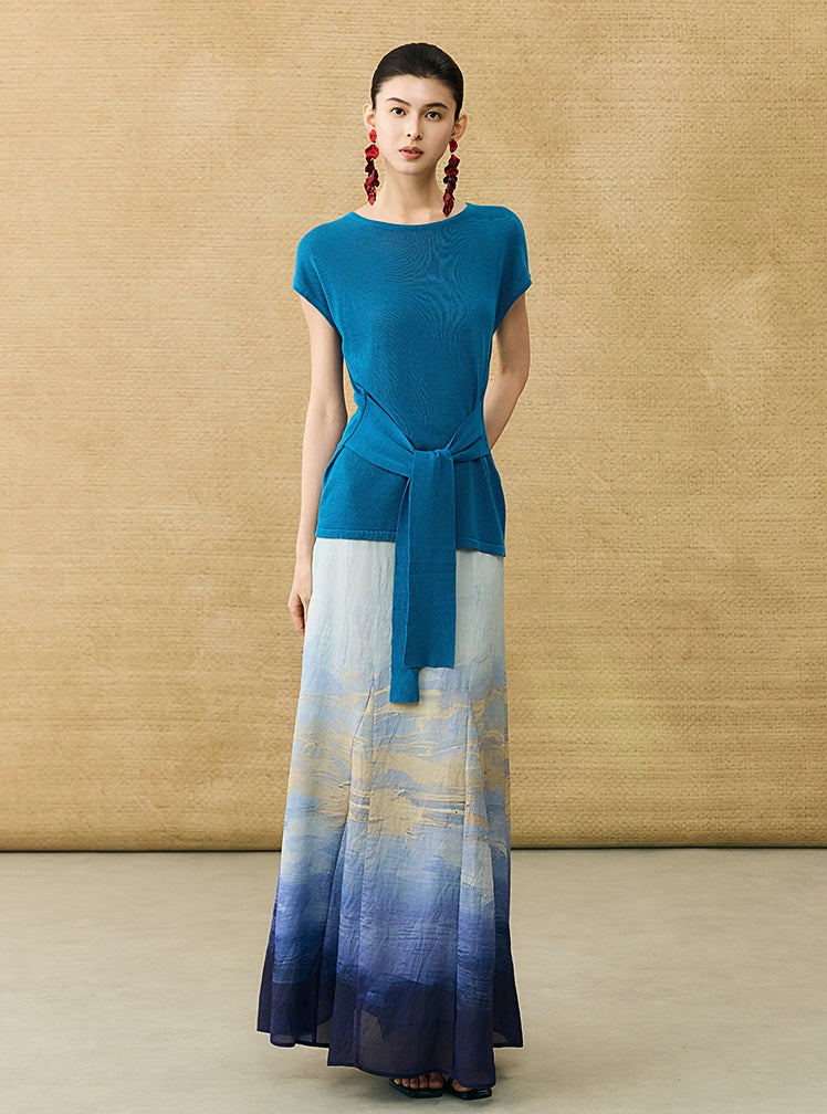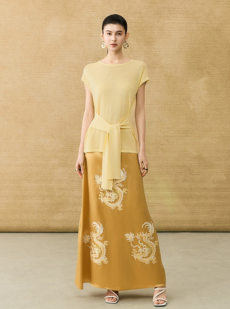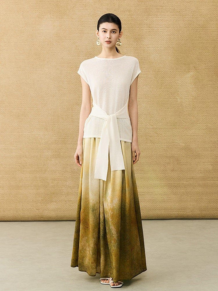 This breathable linen knit T-shirt features a classic crew neck and short sleeves for comfortable, everyday wear. The slim-fitting design is enhanced by a self-tie belt at the waist, allowing for a customizable fit that flatters your silhouette with subtle elegance.