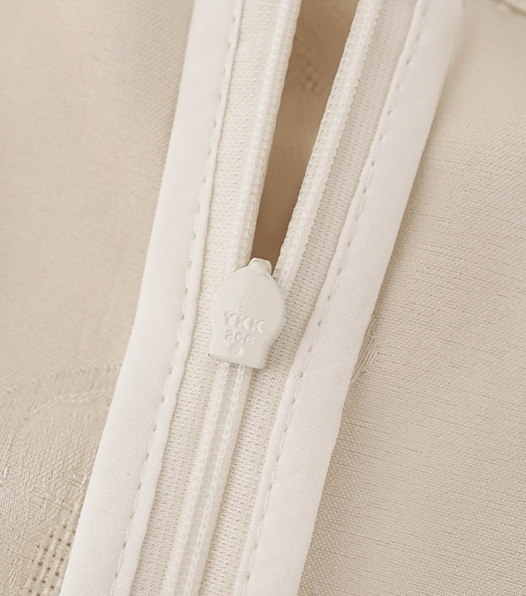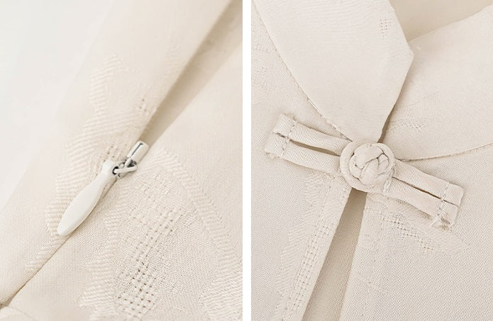 The HECO Chinese stand-up collar vest top features a sleeveless design with pressed pleats that create a structured, refined look. Pleated sides add a subtle peplum effect, enhancing the silhouette with elegant volume and movement. This top blends traditional elements with modern tailoring, perfect for a polished and sophisticated outfit.