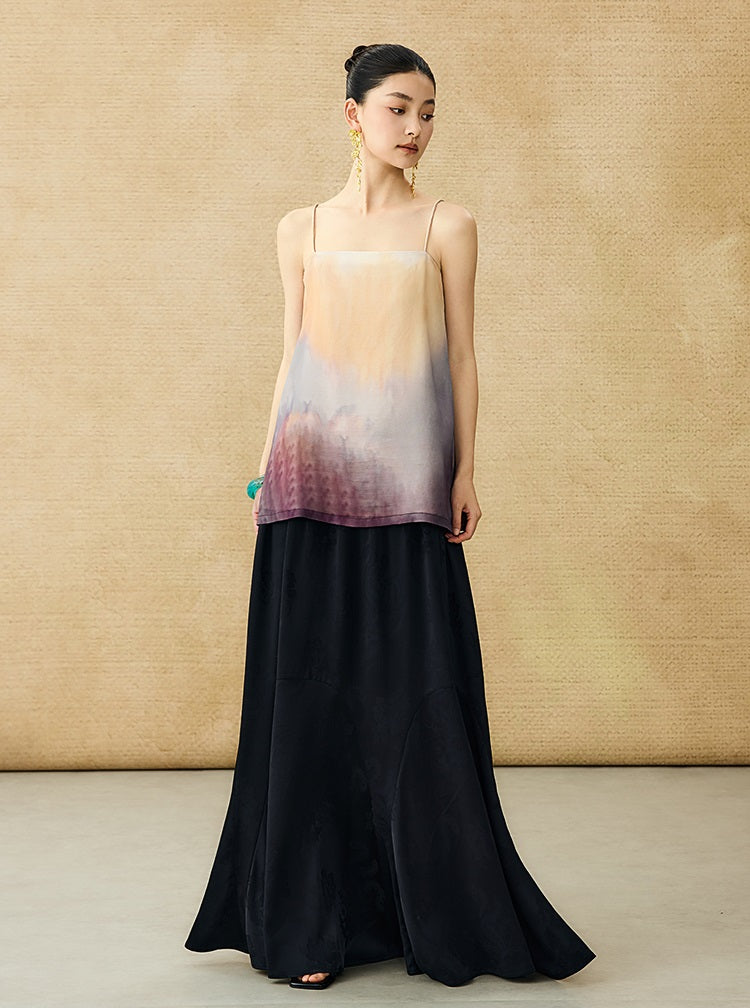 This high-waisted fishtail skirt combines traditional Chinese acetate jacquard fabric with modern design for a flattering silhouette. The elasticated waistband ensures a comfortable fit, while the maxi length and flared fishtail hem create elegant movement. Perfect for formal occasions or stylish everyday wear, it offers both comfort and refined sophistication.