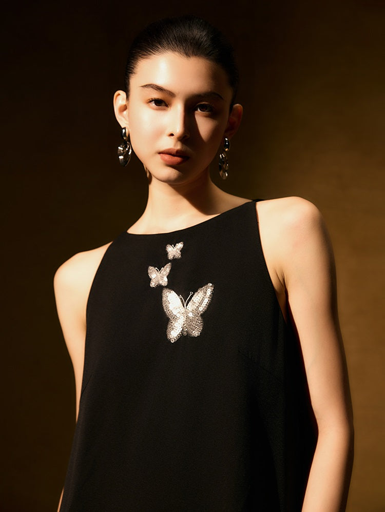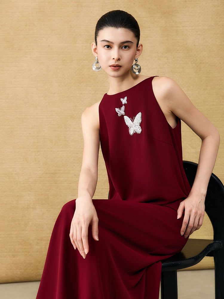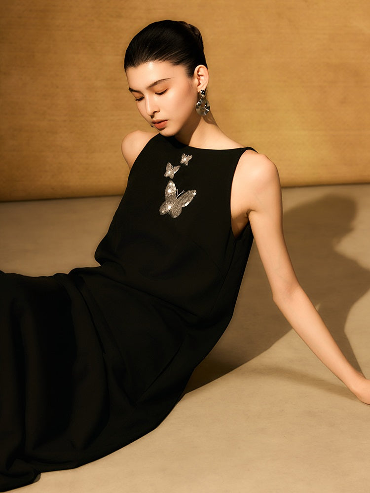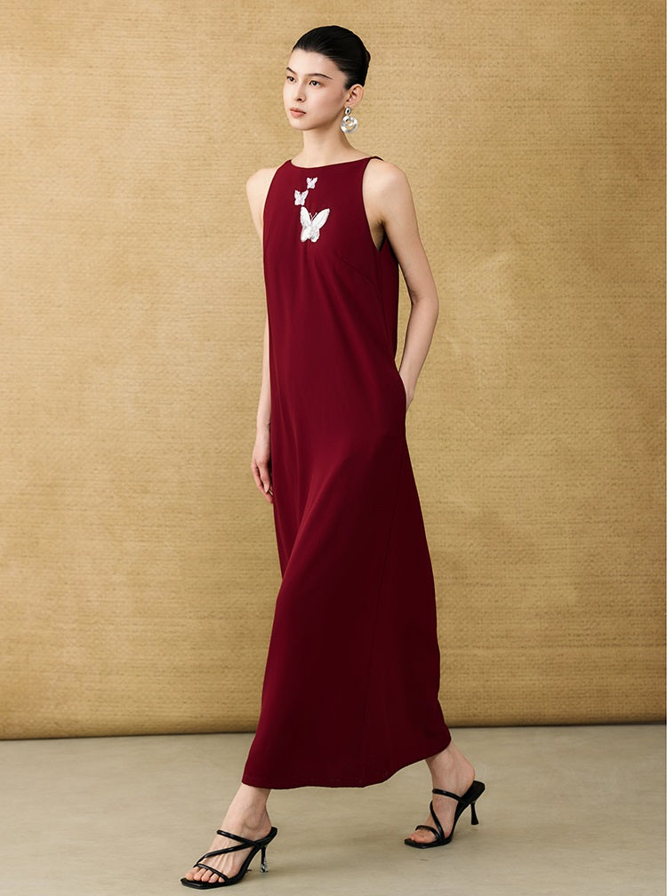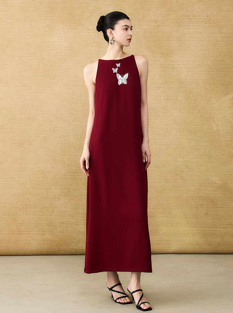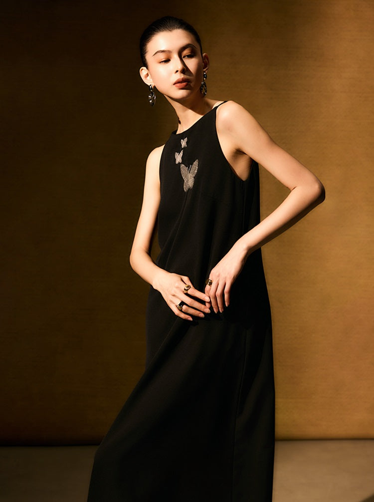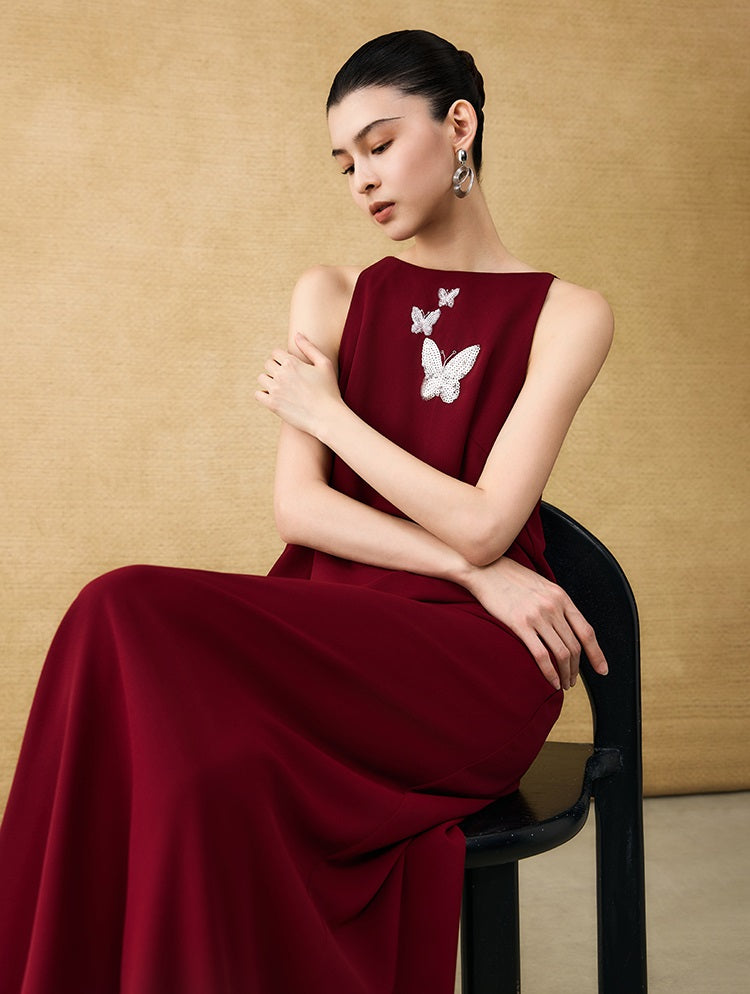 The HECO Chinese style dress features an elegant A-line silhouette with a long, sleeveless design that enhances grace and movement. Adorned with intricate butterfly bead embroidery, this piece adds delicate artistry and texture, creating a harmonious blend of traditional craftsmanship and modern sophistication. Perfect for occasions where refined elegance is essential.