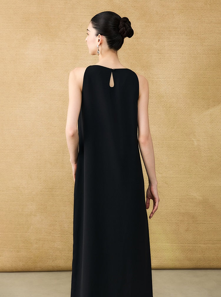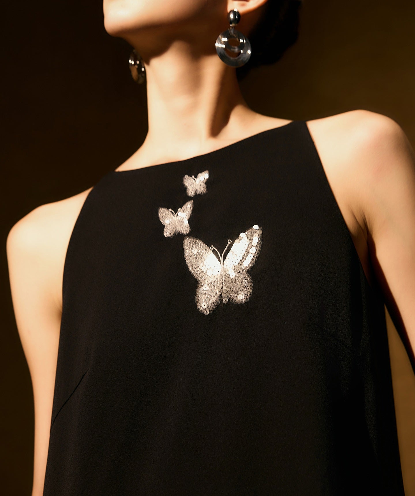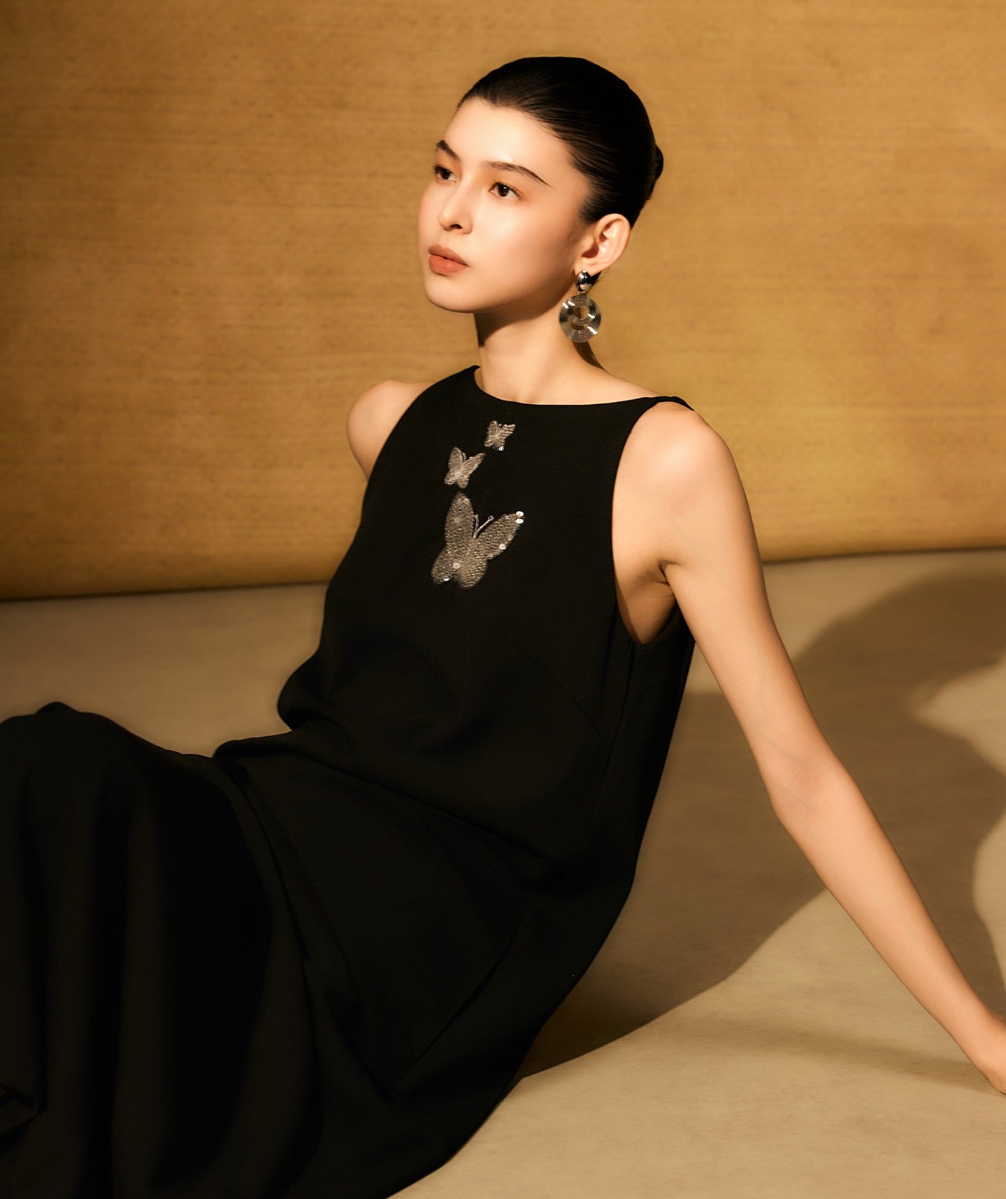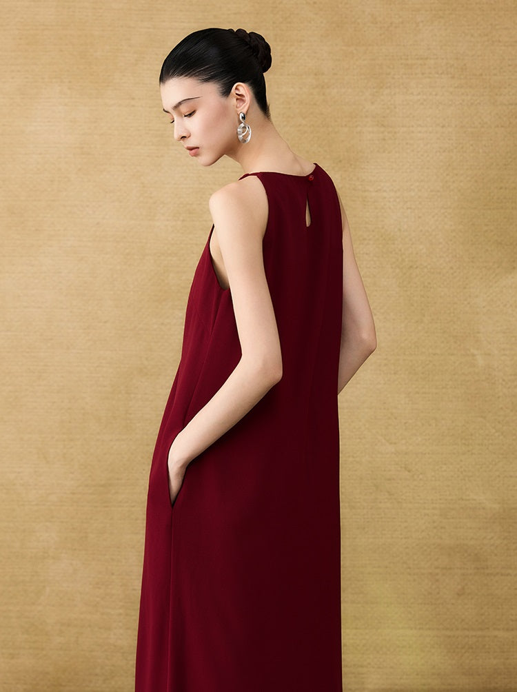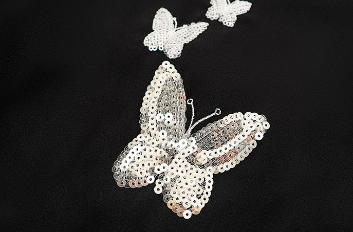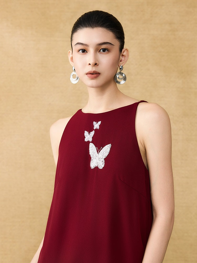 The HECO Chinese style dress features an elegant A-line silhouette with a long, sleeveless design that enhances grace and movement. Adorned with intricate butterfly bead embroidery, this piece adds delicate artistry and texture, creating a harmonious blend of traditional craftsmanship and modern sophistication. Perfect for occasions where refined elegance is essential.