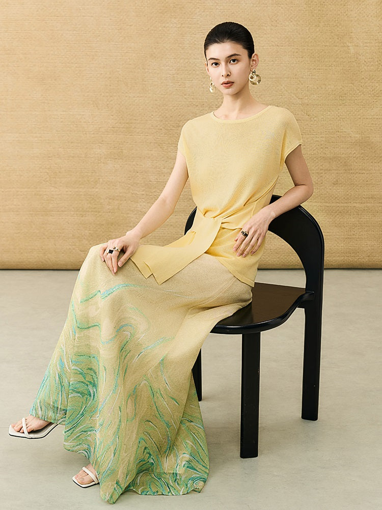 The HECO Chinese Style Gradient Print Skirt features an elegant A-line silhouette crafted from lightweight chiffon, offering graceful movement and breathability. Its long length is enhanced by a beautiful ombre gradient, delivering a subtle yet captivating visual transition. This skirt embodies summer charm and refined temperament, making it an ideal choice for those seeking a sophisticated and comfortable piece with a modern nod to traditional Chinese aesthetics.