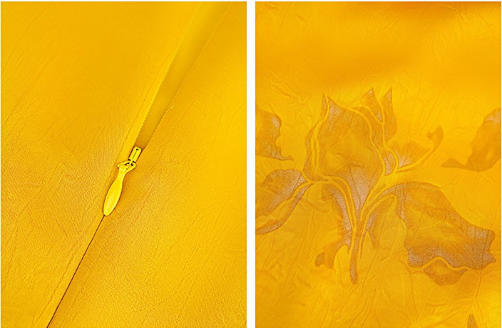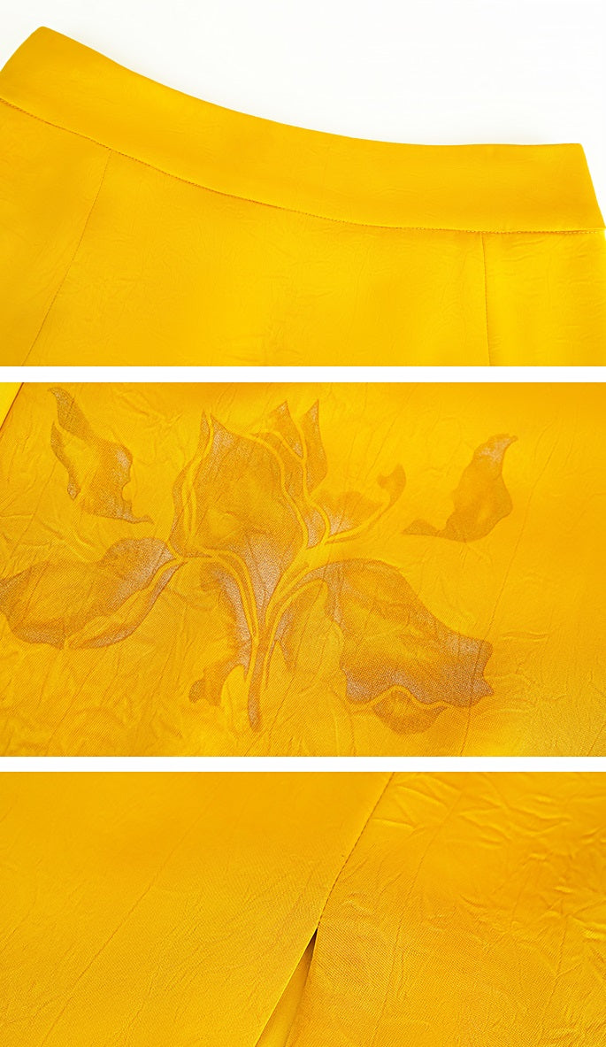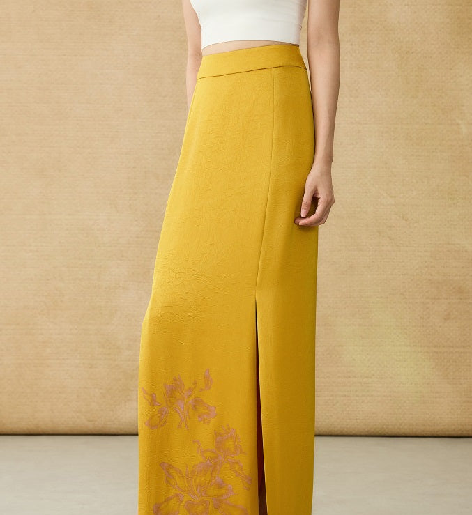 This long, high-waisted skirt features a straight hip silhouette with slits on both sides for ease of movement and a modern edge. Rendered in a striking black and yellow combination, it offers a sophisticated yet bold look ideal for warm-weather wear or stylish occasions.