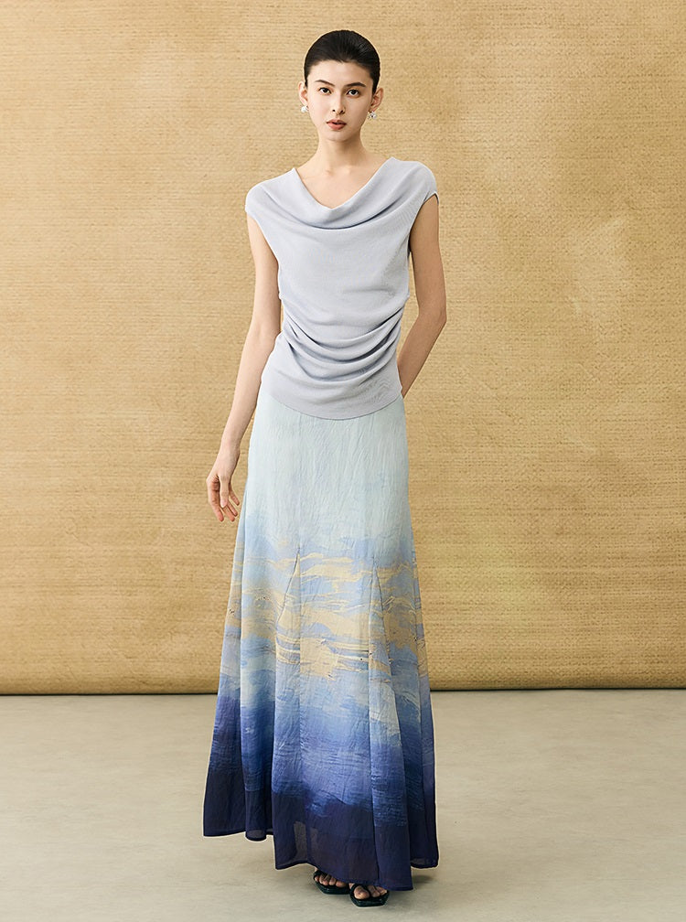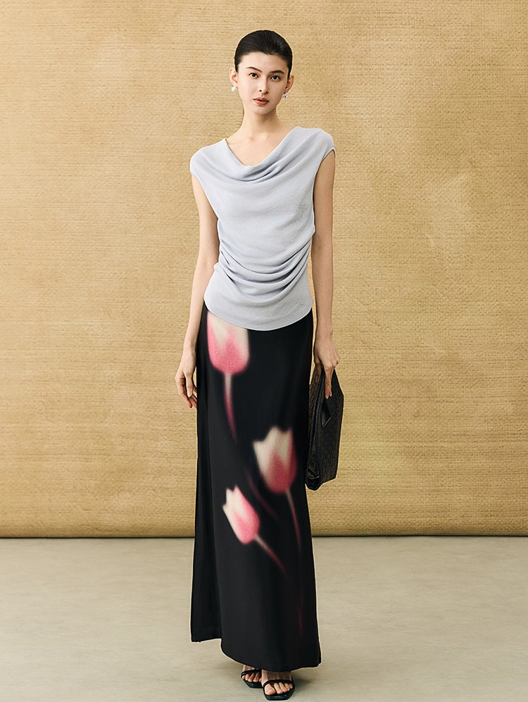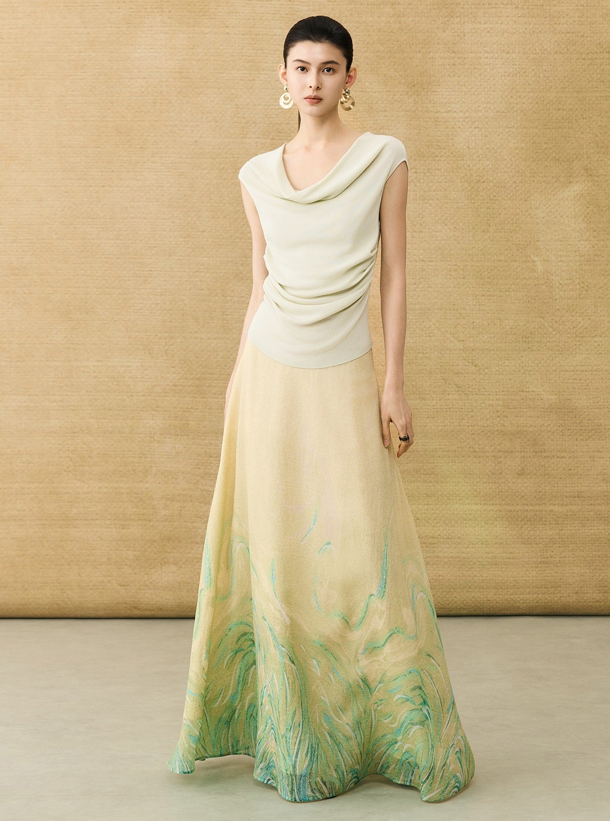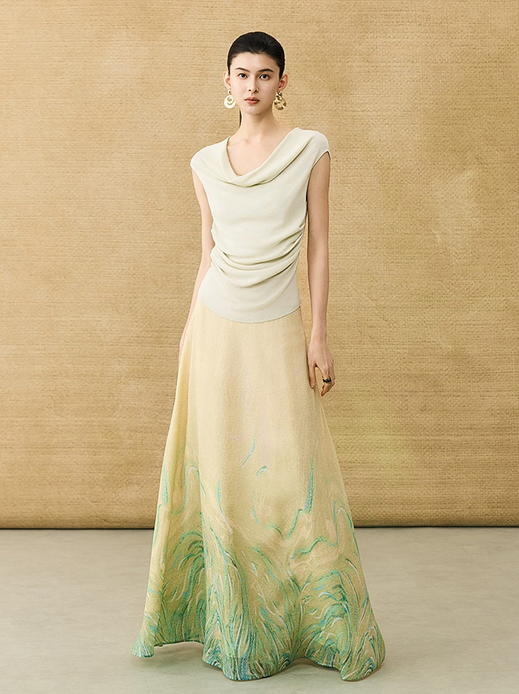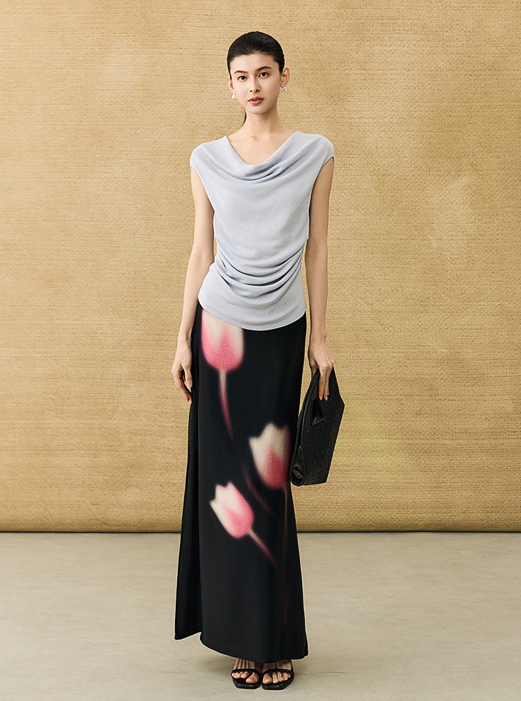 This sleeveless knitted sweater T-shirt showcases an elegant draped fold across the front that forms a flattering V-shaped neckline. The swing collar adds subtle movement and a refined silhouette, blending traditional Chinese style with modern sophistication for versatile, polished wear.