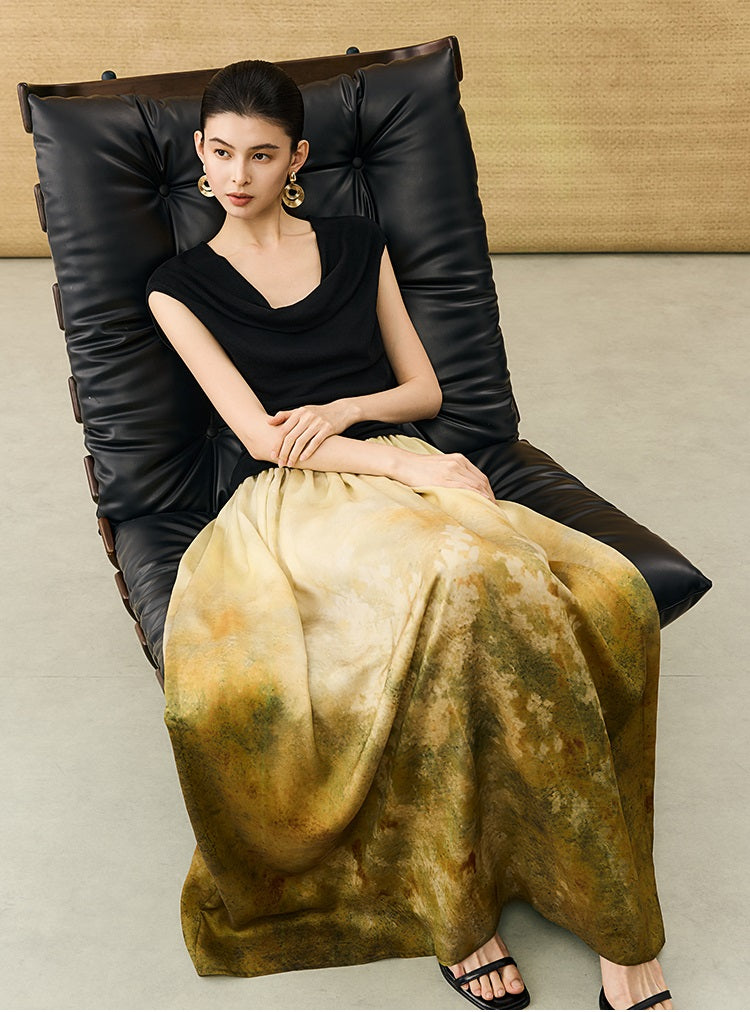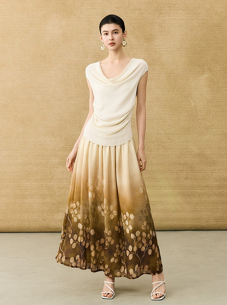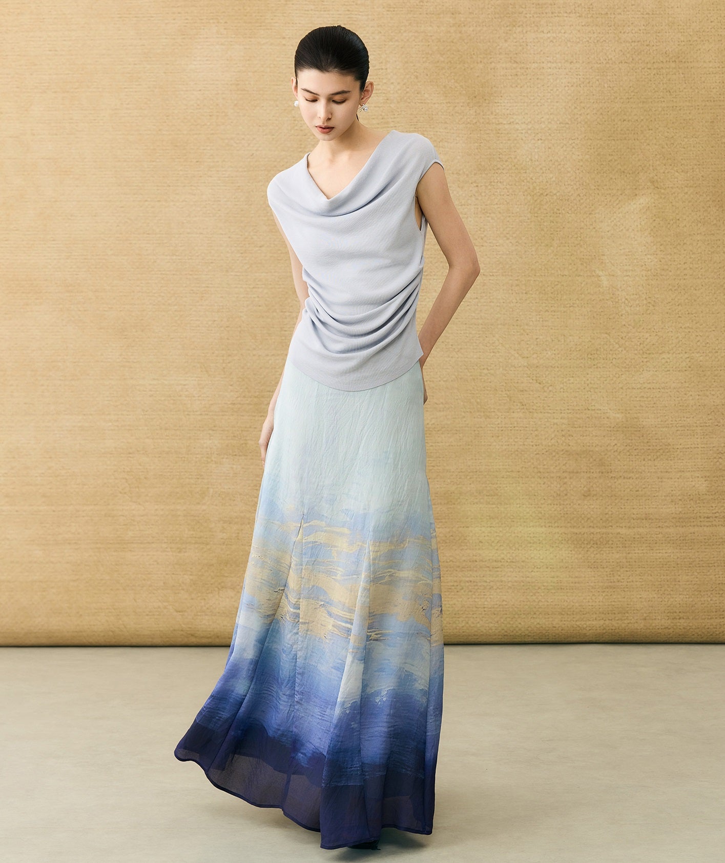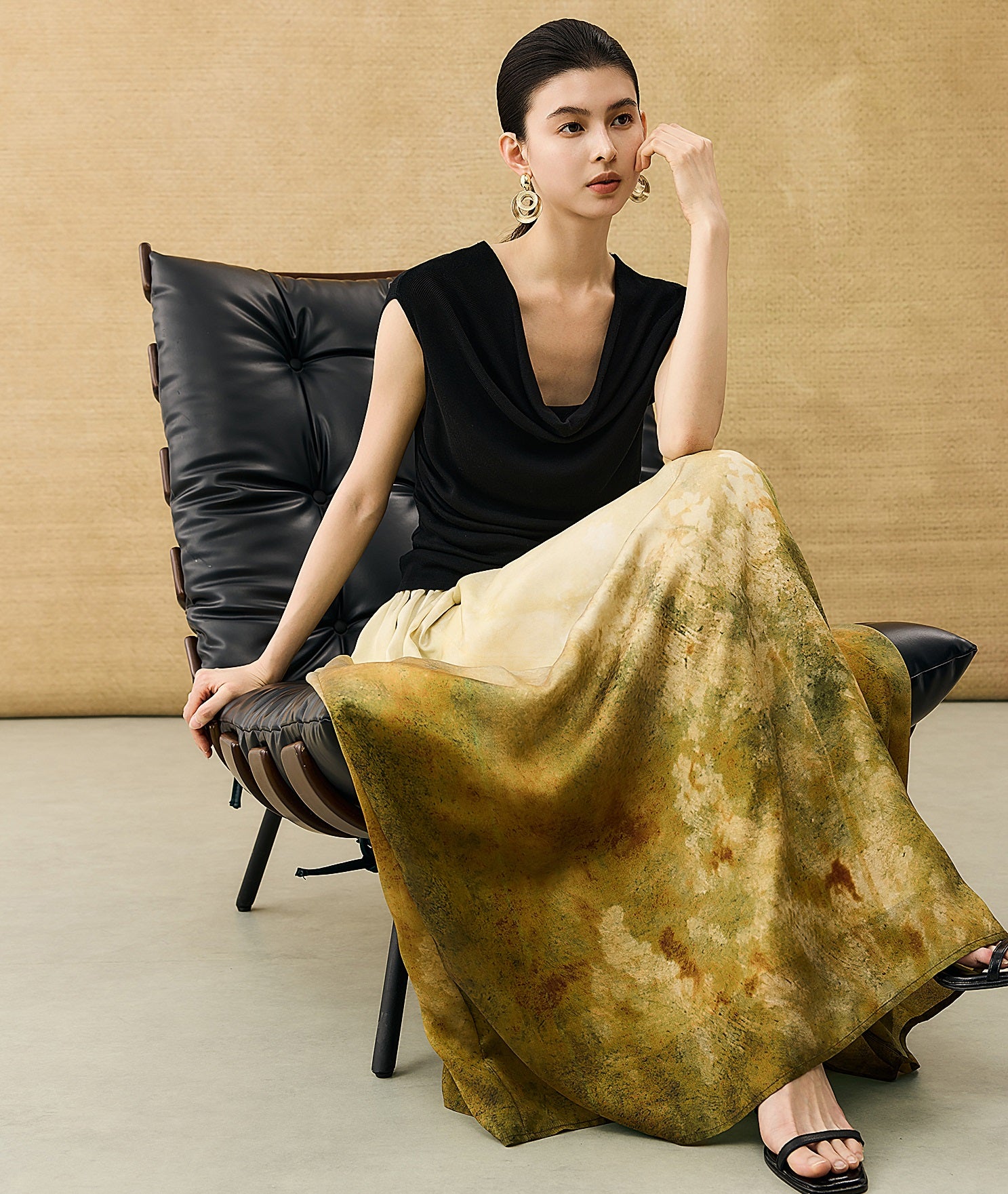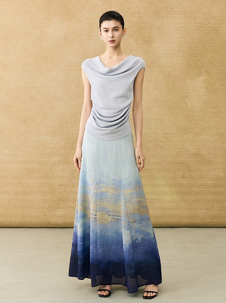 This sleeveless knitted sweater T-shirt showcases an elegant draped fold across the front that forms a flattering V-shaped neckline. The swing collar adds subtle movement and a refined silhouette, blending traditional Chinese style with modern sophistication for versatile, polished wear.
