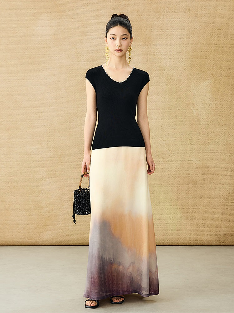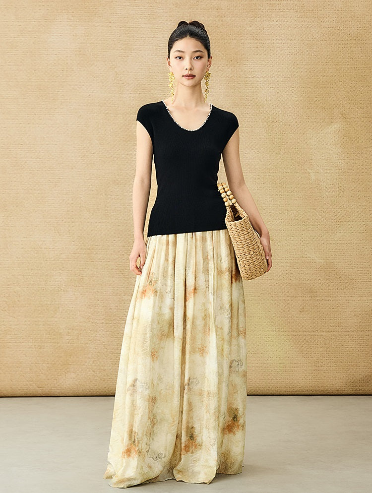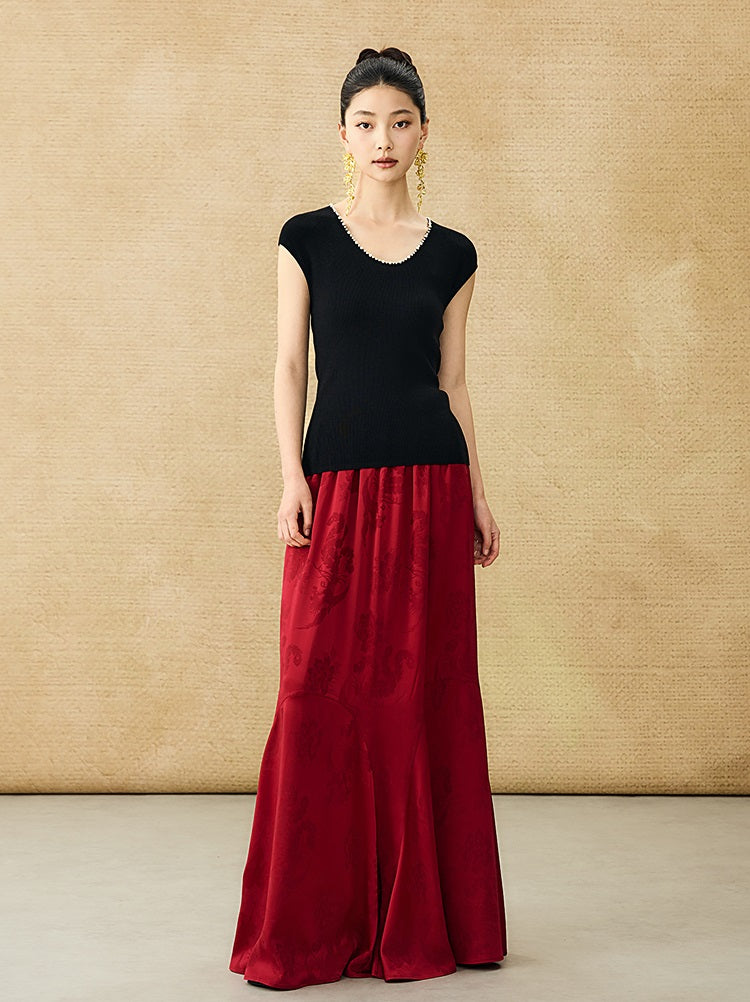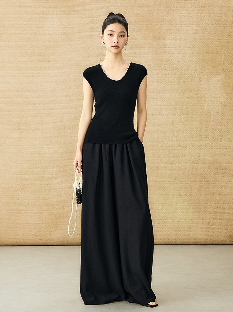 This HECO Chinese-style sleeveless top features a flattering U-neck adorned with delicate nail bead detailing, adding a refined touch to its design. Crafted from stretchable woven knit fabric, it offers both comfort and a tailored fit. The small fly sleeves enhance its elegant silhouette, making it an ideal choice for sophisticated, modern styling.