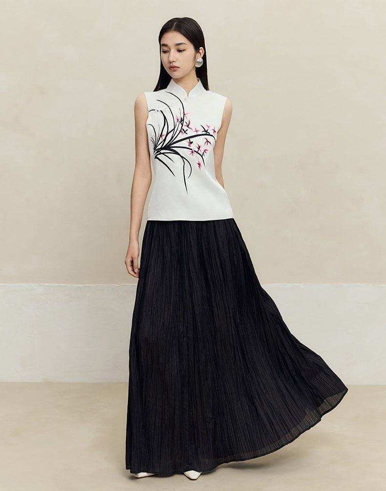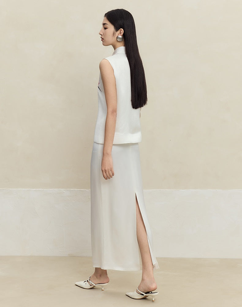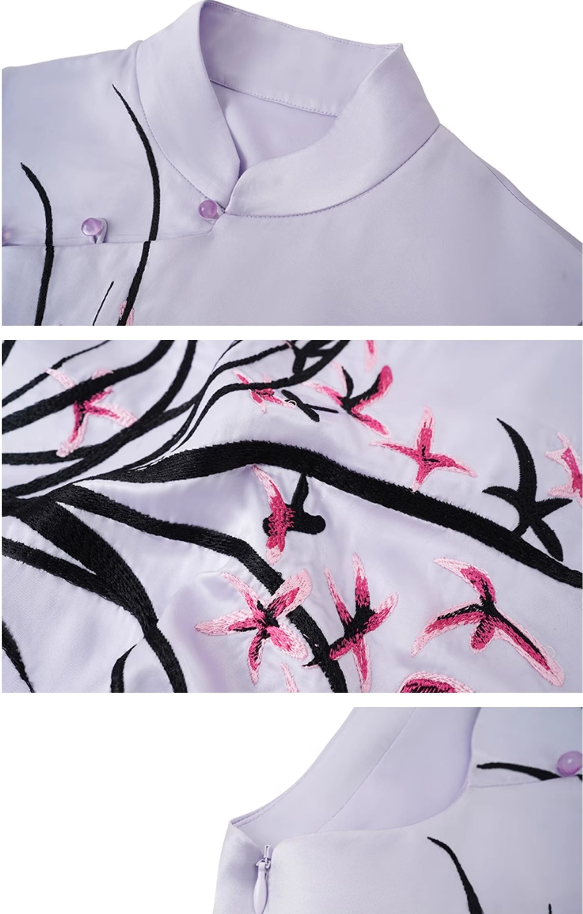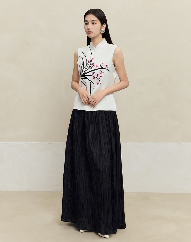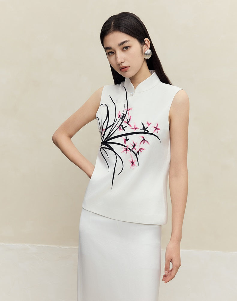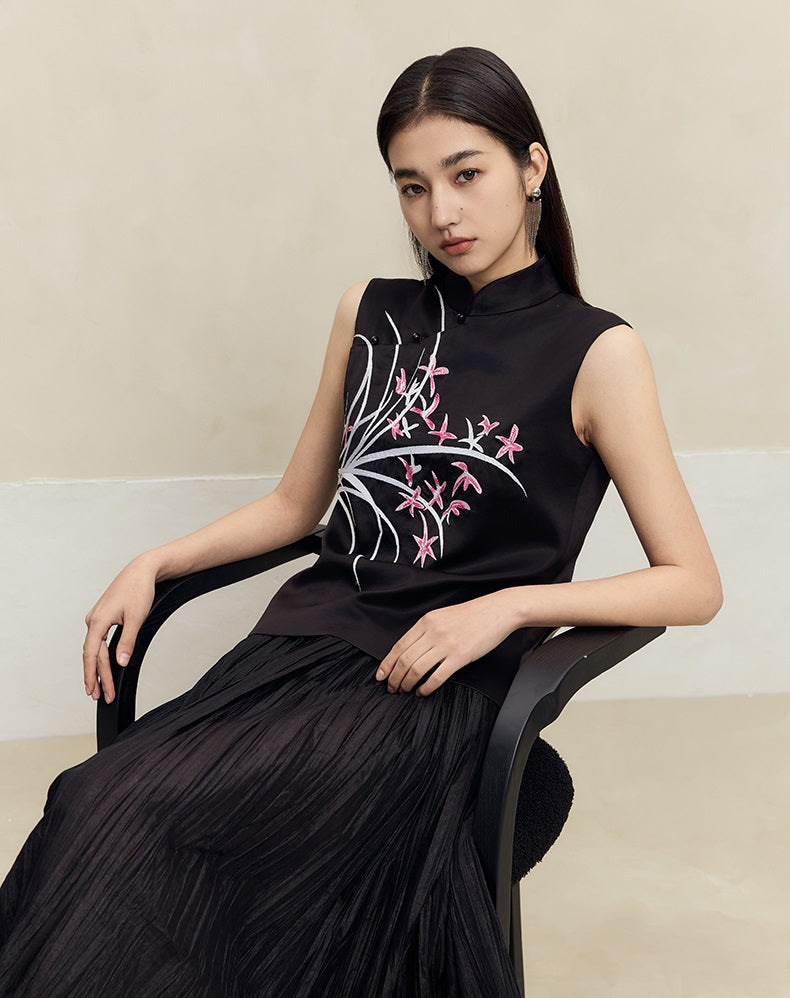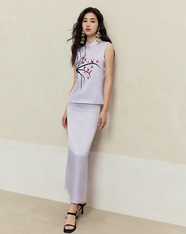 This HECO sleeveless vest top features intricate embroidery and a stand collar, crafted from a luxurious blend of 62% acetate fiber and 38% cuprammonia fiber for a smooth, elegant finish. Available in purple, black, and white, it offers a refined silhouette perfect for layering or standalone wear in sophisticated ensembles.