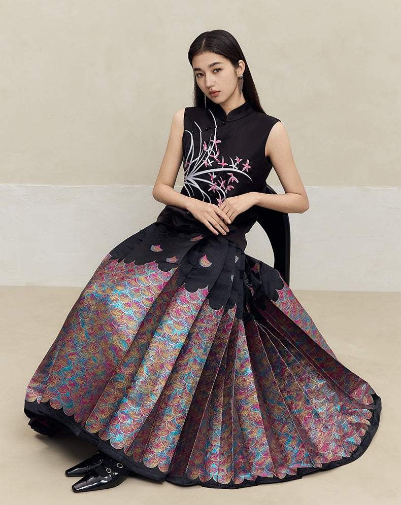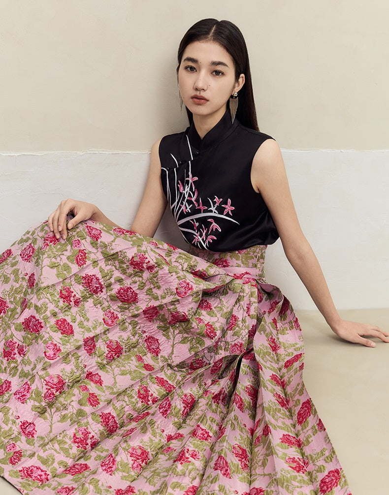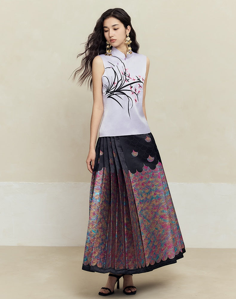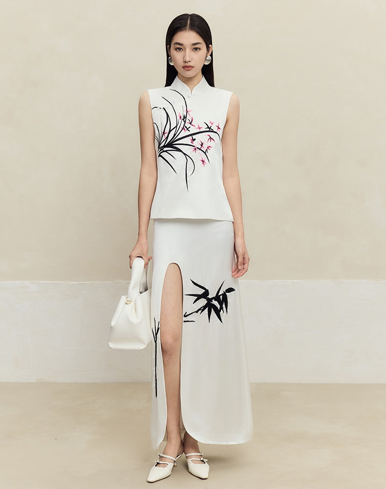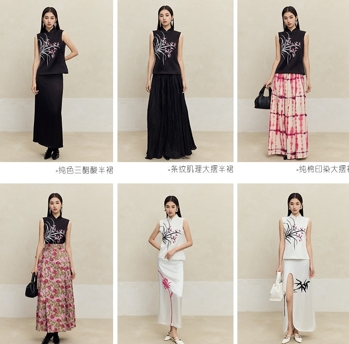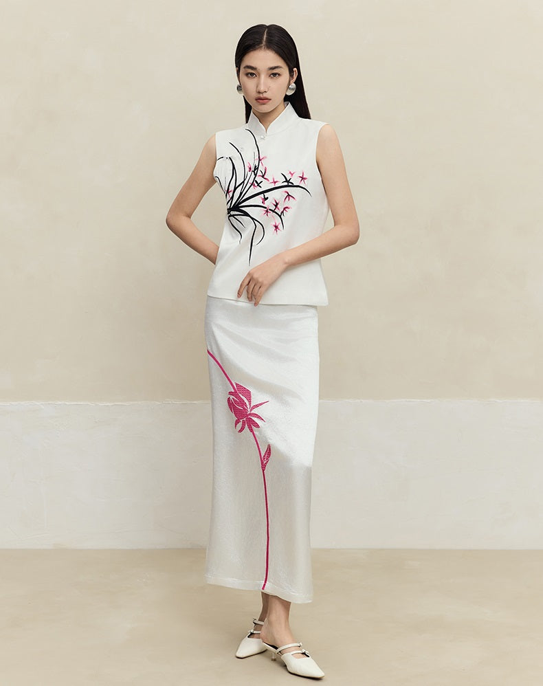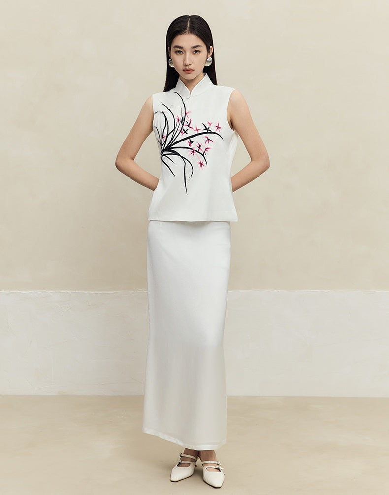 This HECO sleeveless vest top features intricate embroidery and a stand collar, crafted from a luxurious blend of 62% acetate fiber and 38% cuprammonia fiber for a smooth, elegant finish. Available in purple, black, and white, it offers a refined silhouette perfect for layering or standalone wear in sophisticated ensembles.