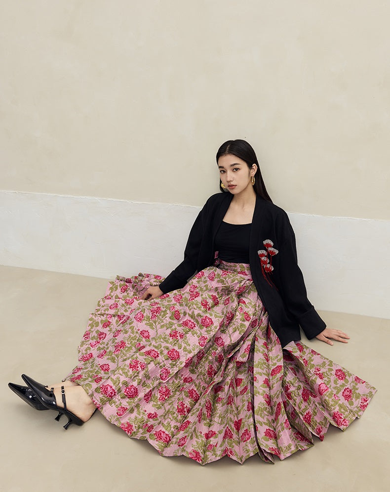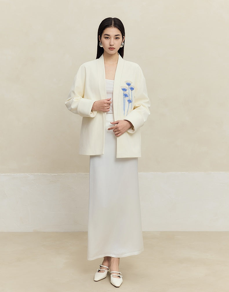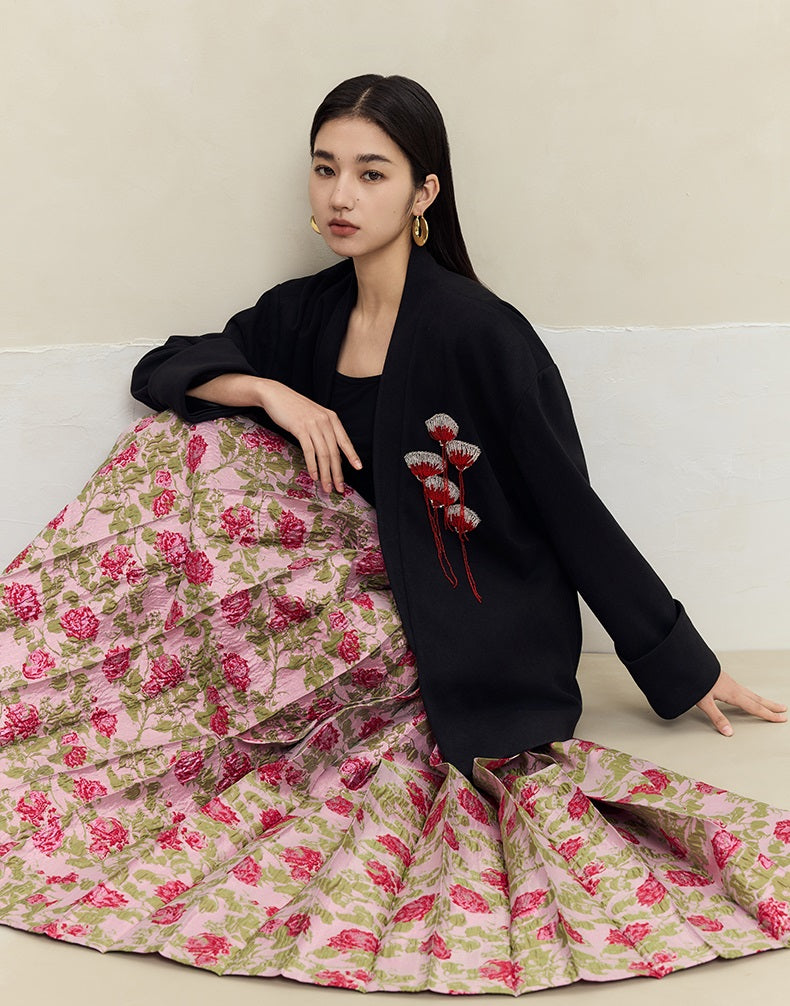 This HECO long blazer combines 85% polyester, 10% viscose, and 5% spandex for a comfortable, flexible fit. Featuring black and white tones, it is distinguished by intricate handmade fan bead embellishments, offering a refined and elegant statement piece ideal for sophisticated wardrobes.