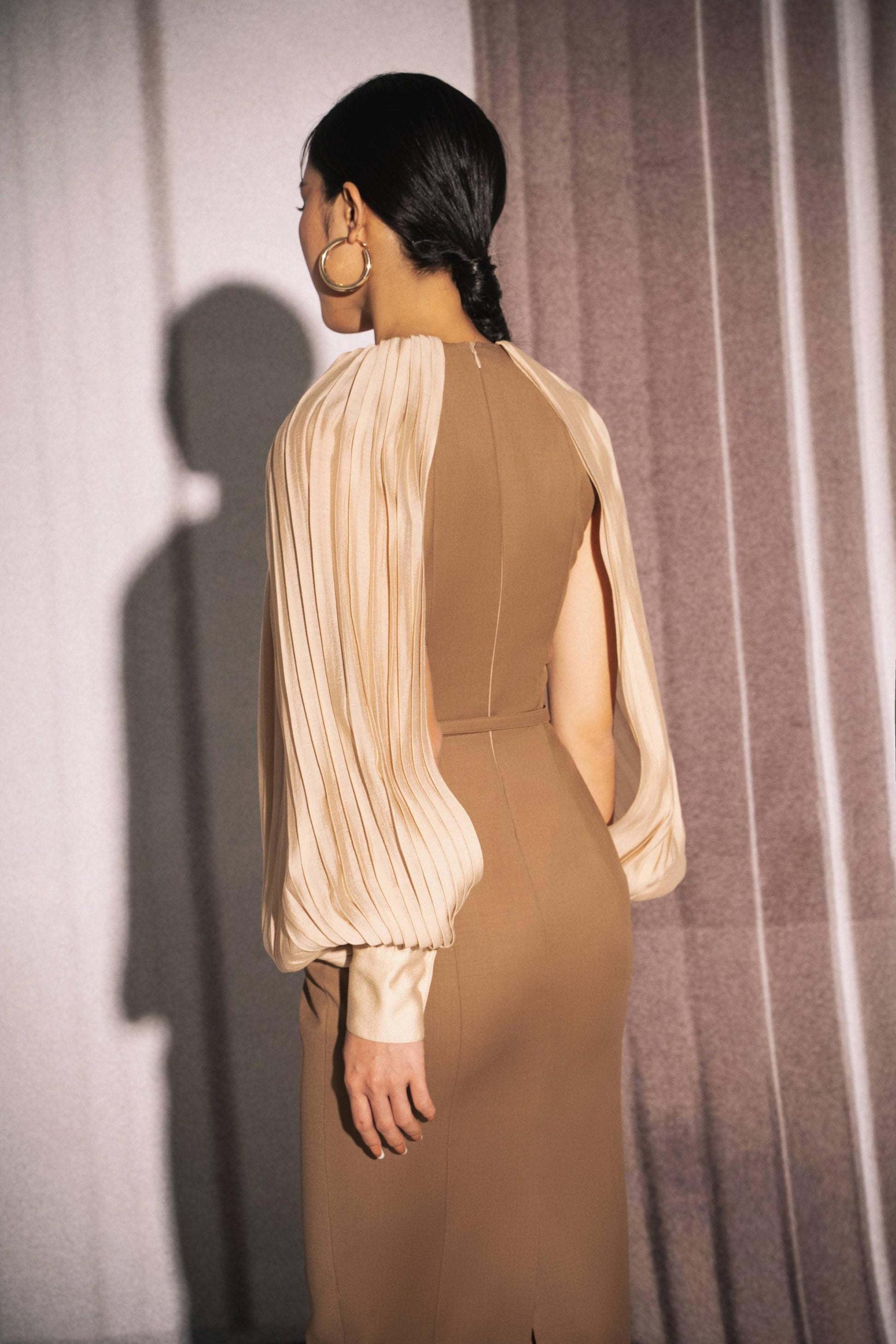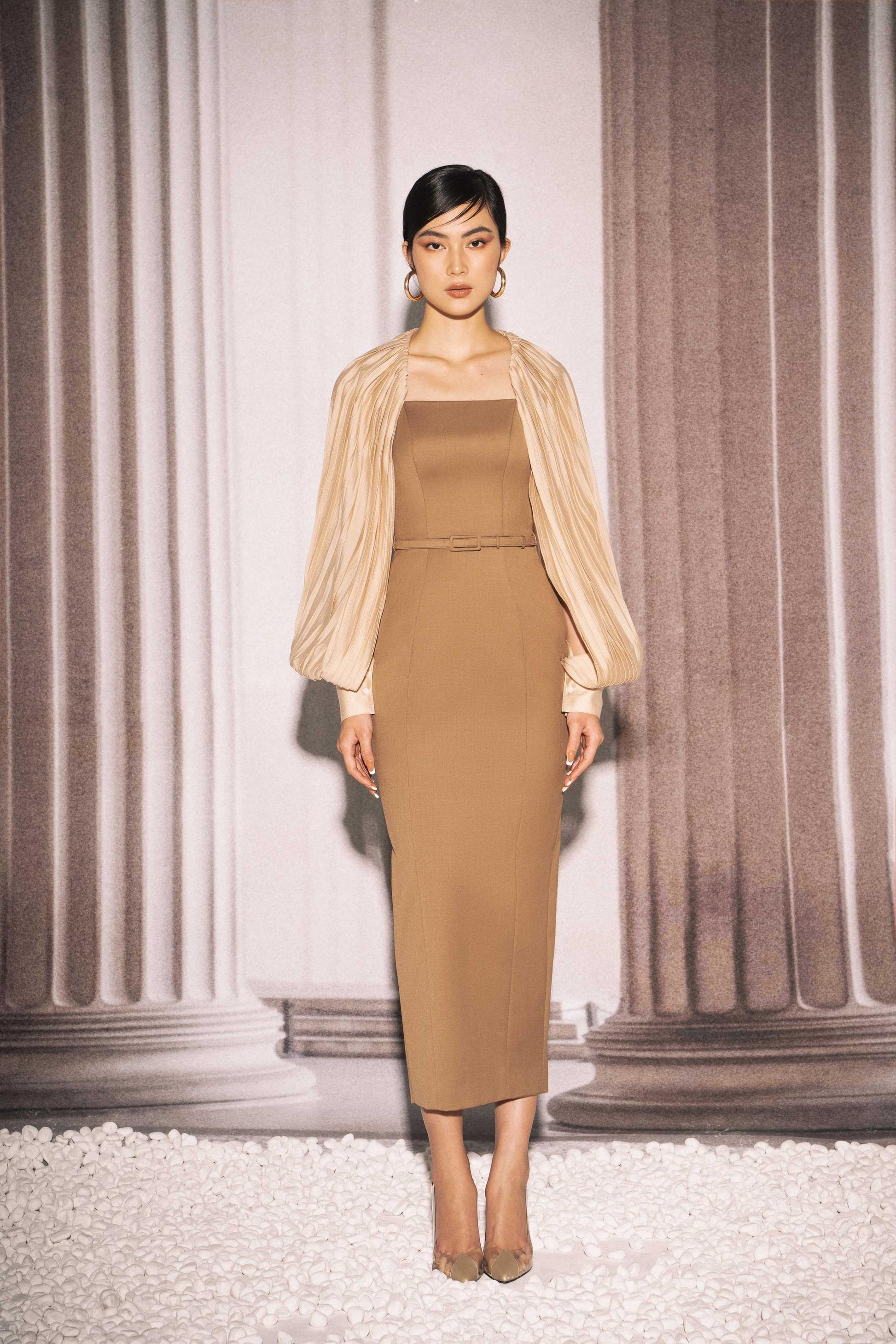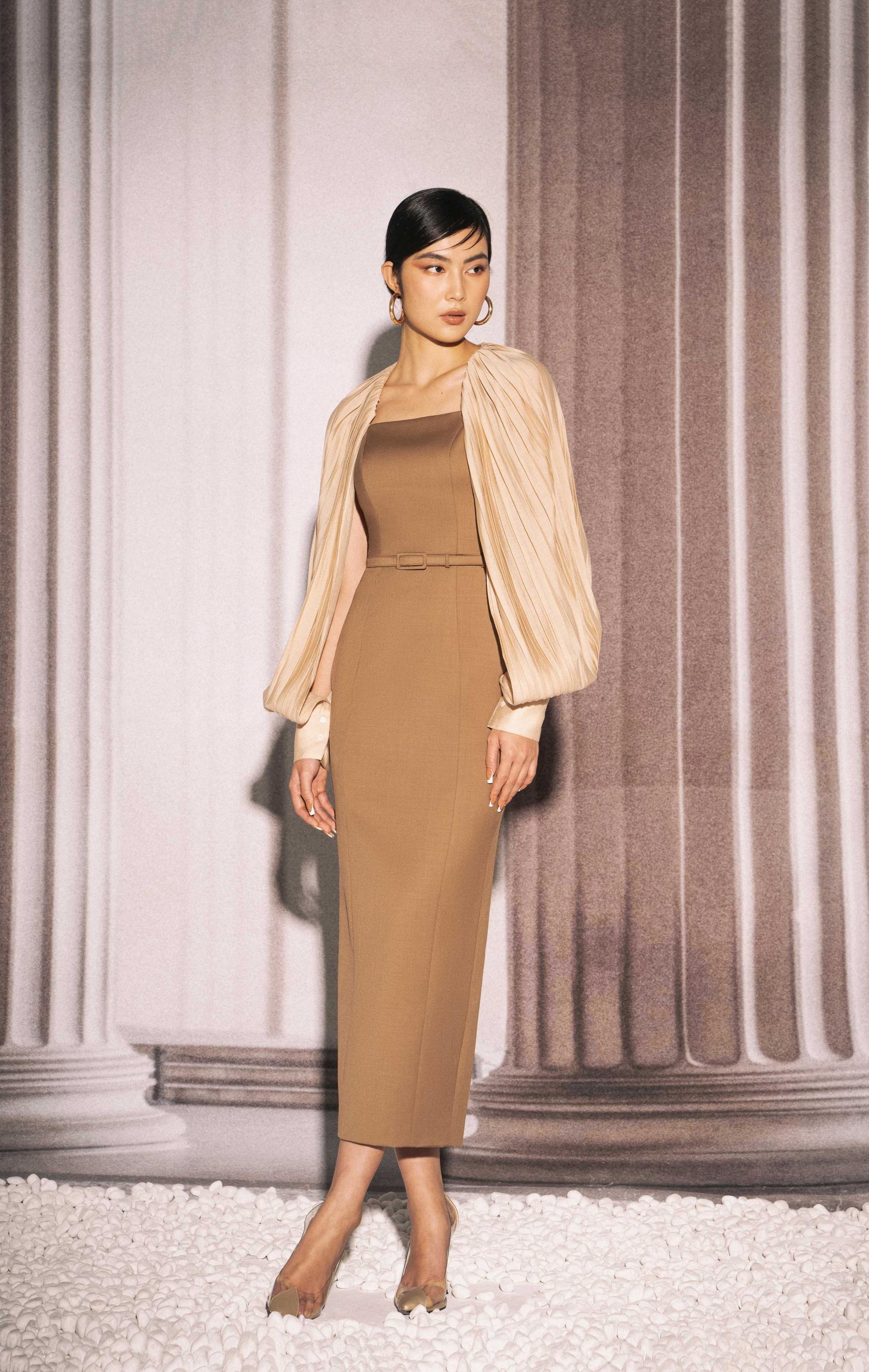 Minimal, sharp cropping lines in absolute precision, using tailoring techniques to highlight a woman's most seductive curves. The sleeve of the dress are made of silk, which creates perfect harmony for the overall look and is most comfortable for the wearer.