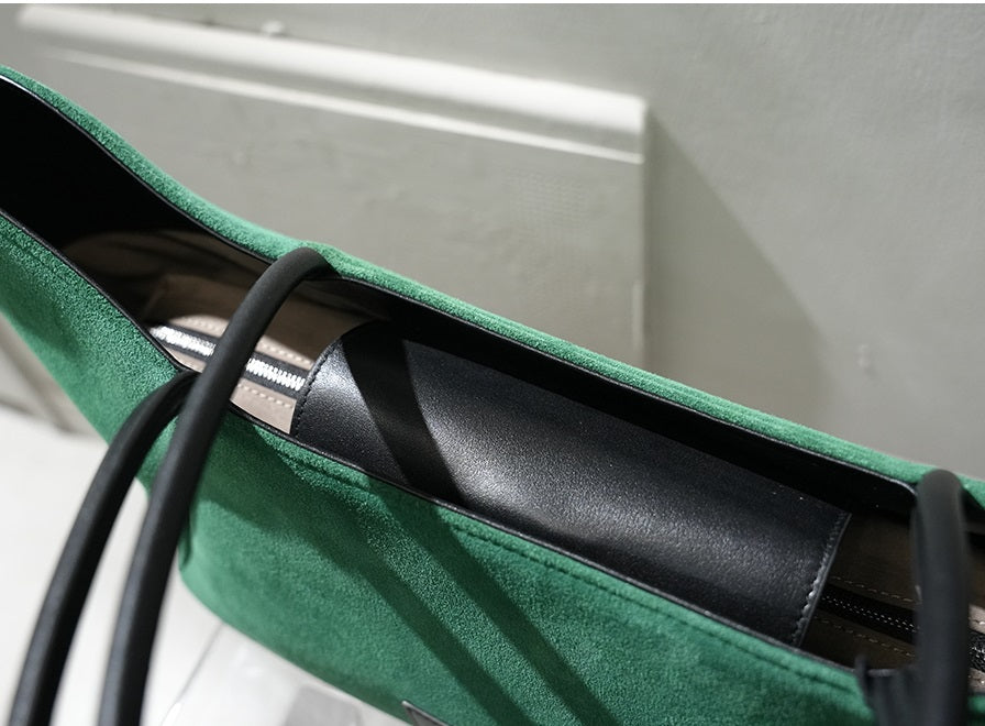 The IUBALLET Nubuck Cowhide Tote Large Bag features suede leather with a matte, textured finish for a refined, understated look. Its mother-and-child compartment structure offers organized storage, while the flap closure provides secure access. Expertly crafted, this large tote combines durability with sophisticated design, ideal for everyday use.