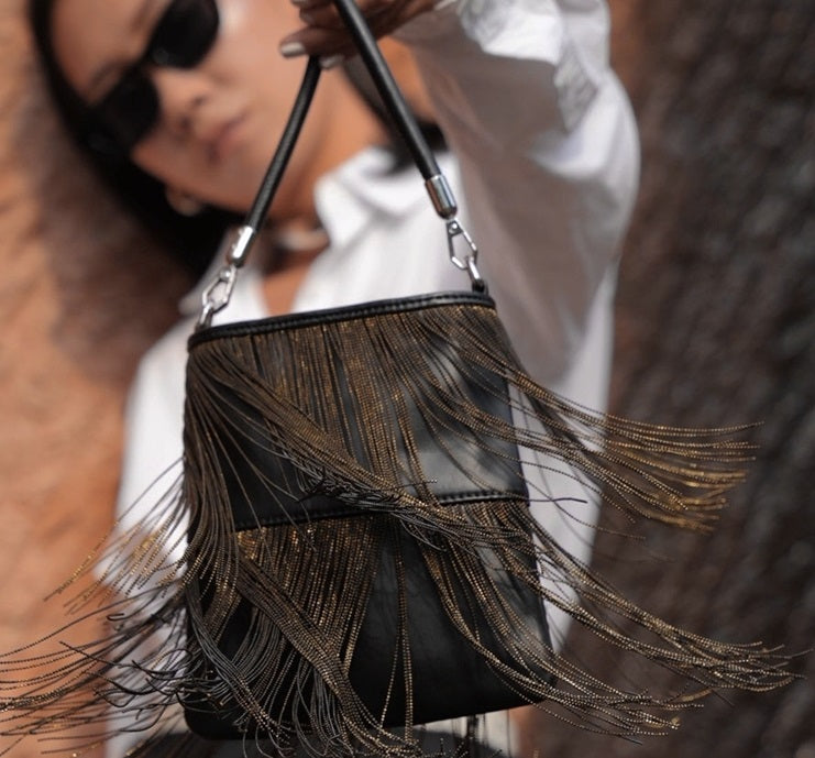 The IUBALLET Stylish Tassel Mobile Fringe Bag combines a striking chain fringe design with a supple leather shoulder strap for a blend of bold style and comfort. Expertly crafted, this bag offers a unique texture and secure carry, making it a versatile accessory for both casual and refined looks.