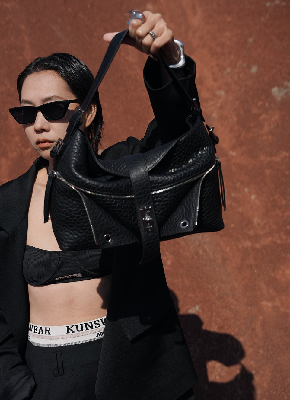 The IUBALLET Chic Crossbody Small Bag is crafted from black bubble lambskin patent leather, combining luxury with durability. It features one main pocket and one insert pocket for organized storage. The bag is secured with a buckle closure and includes both an adjustable strap and a separate short handle strap, each detachable for versatile styling options.