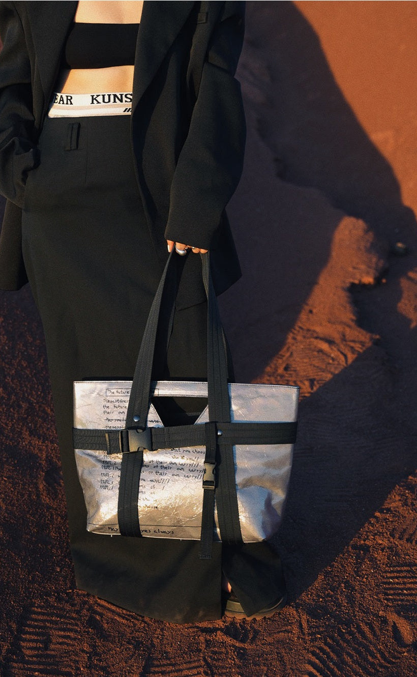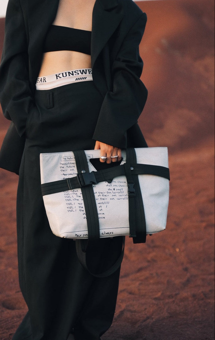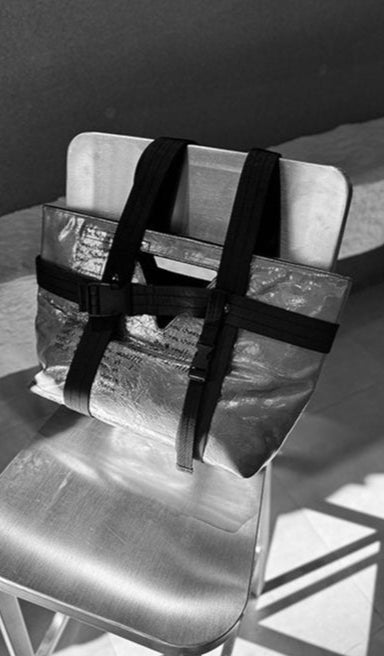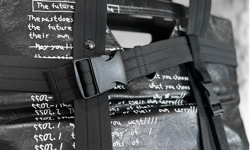 The IUBALLET Turf Cobbler's Leather Tote Bag in gold features a large, high-quality leather body accented by two black webbing straps that extend vertically along the front and back, forming a wraparound design and serving as sturdy top handles. Additional black webbing straps with buckle closures enhance its tactical, utility-inspired look. White text and scribble details on the black surface add a distinctive, handcrafted touch, making this tote a unique blend of functional design and avant-garde style.