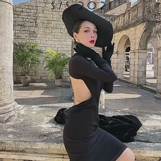Transform your style with Le Palais Vintage's Black Long Sleeve Open Back Matte Satin Cocktail Dress. Its unique design features a long black gown with a dashing open back, perfect for fall or autumn events. This dress exudes luxury and sophistication, making you look glamorous and chic. Elevate your wardrobe with this fabulous and exquisite piece.