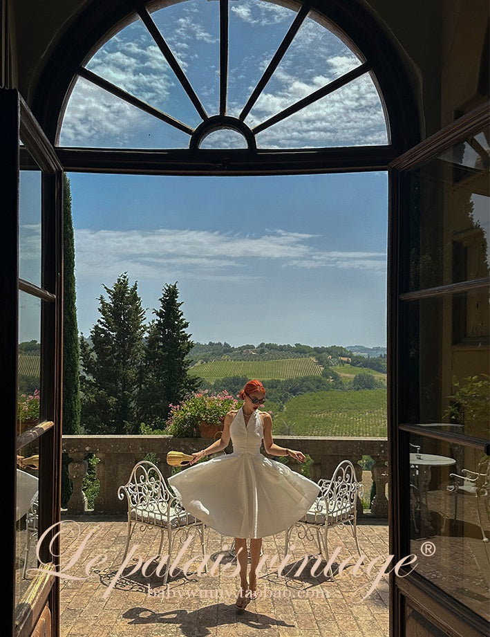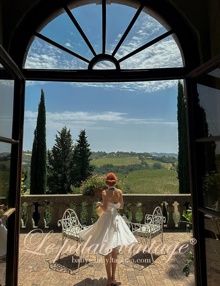 Le Palais Vintage Elegant Pure White Cotton and Linen Halter neck Vest High Waist Swing Skirt-MIA