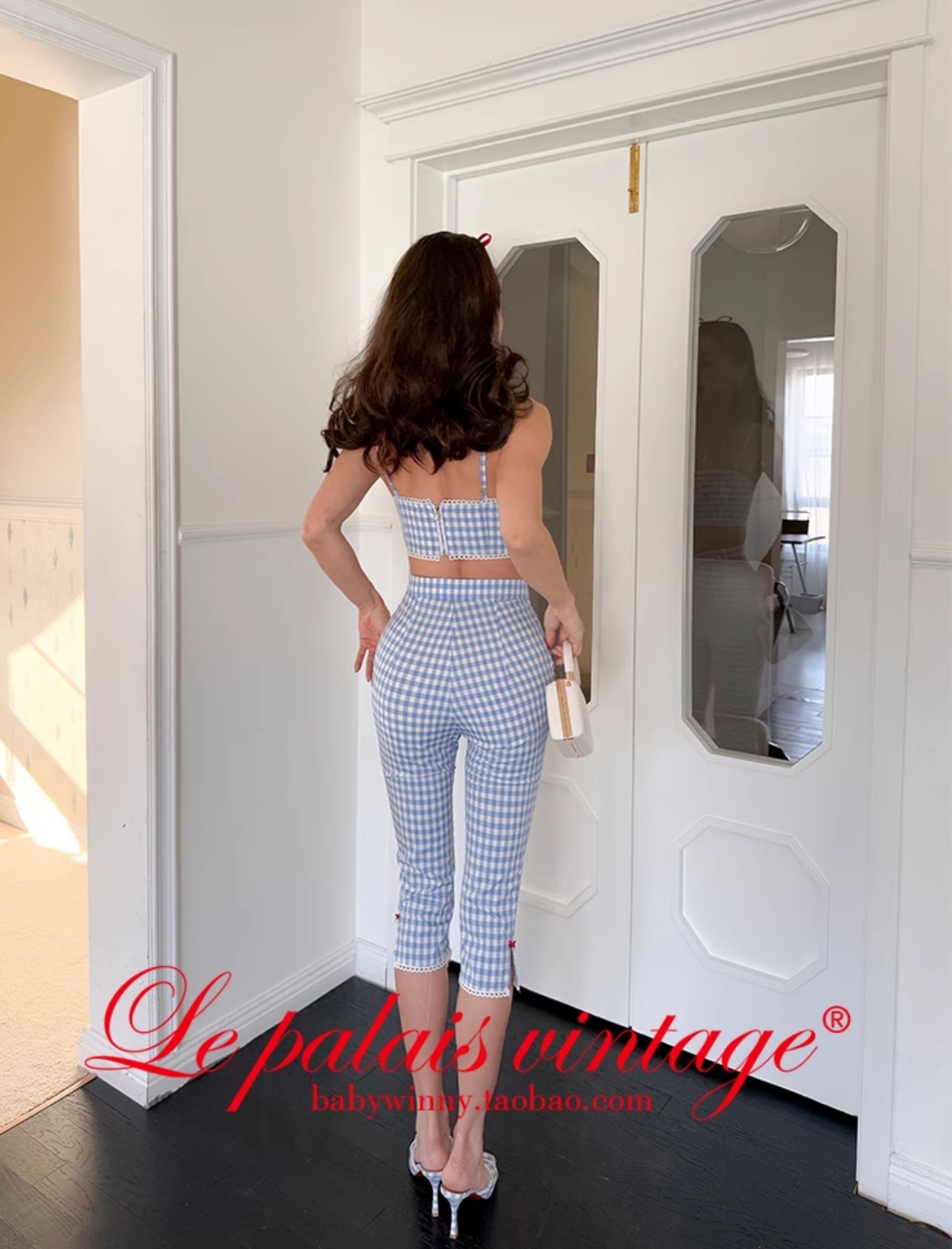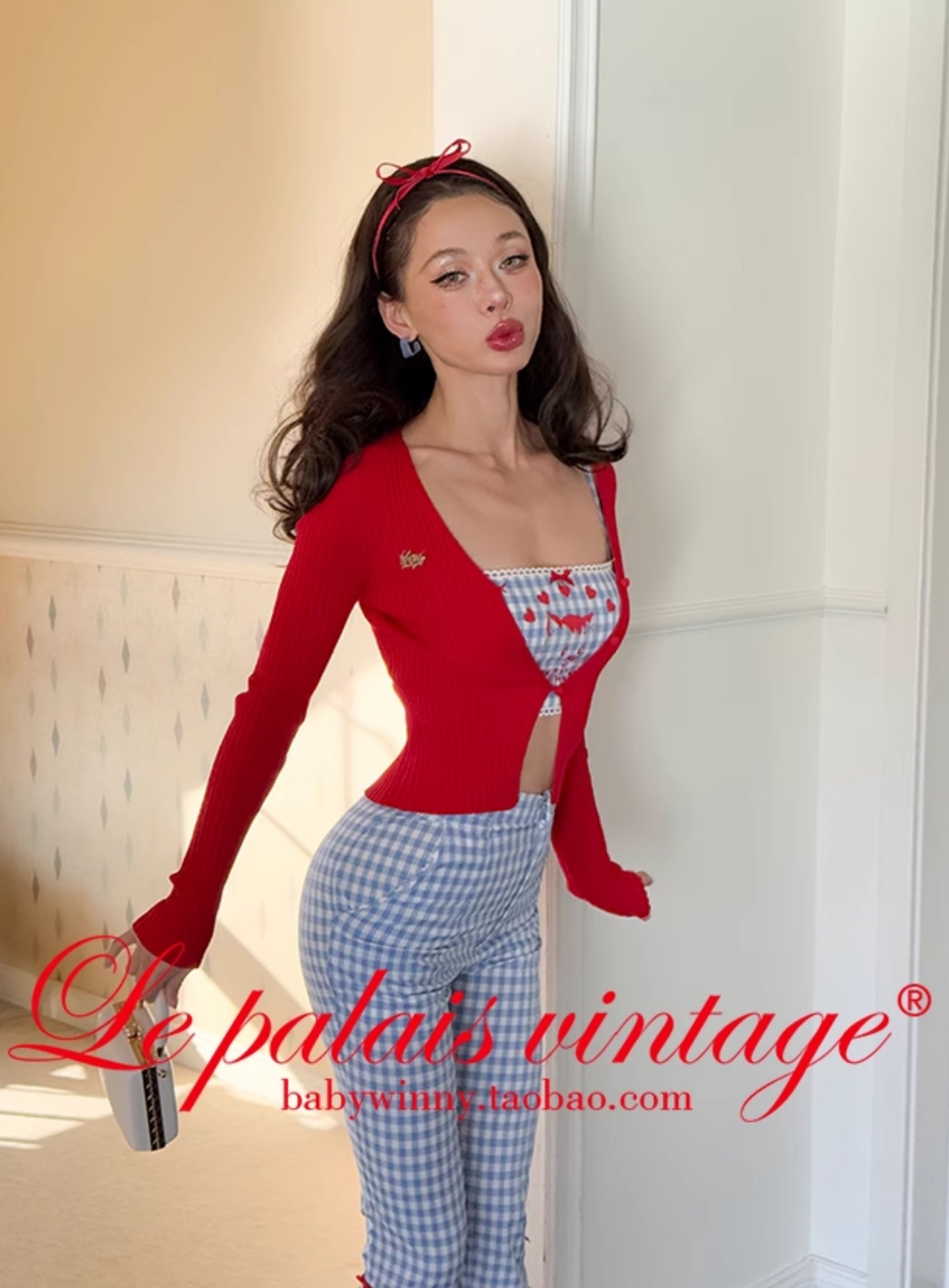 Le Palais Vintage French Blue Shorts Red Slim Cardigan- ELFS.