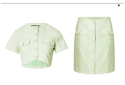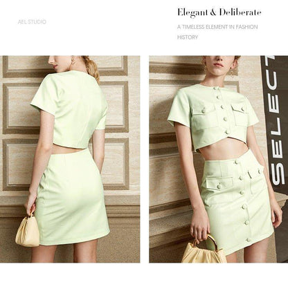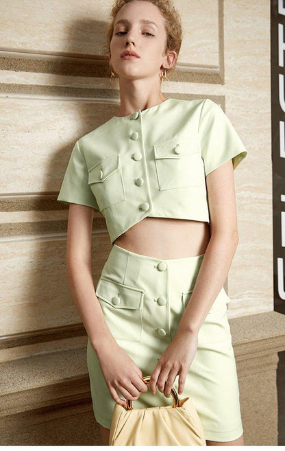 light pastel green Crop blazer Top + High Waist Mini two piece Skirt suit set - Rowq