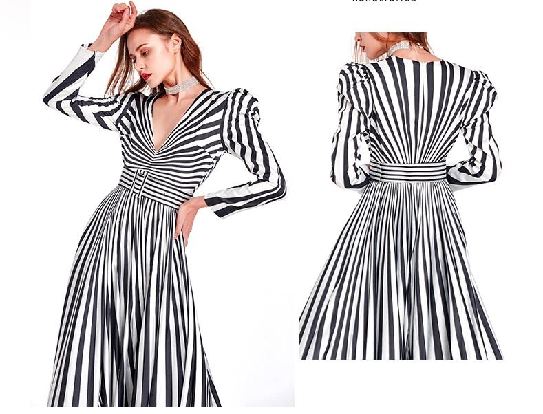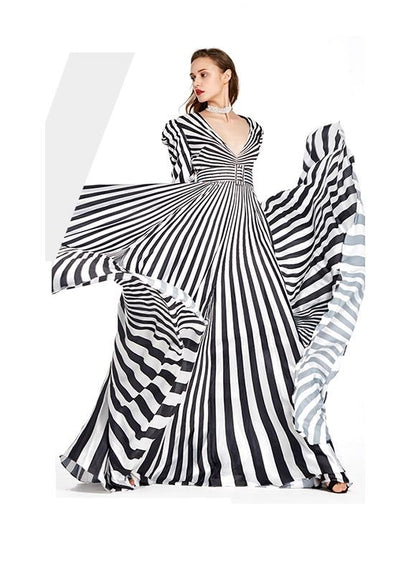 Limited black and white stripe long sleeve V neck maxi evening gown - Cher