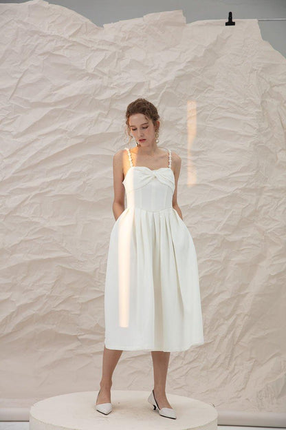 The exquisite white texture adds a touch of opulence, while the midi length strikes the perfect balance between classic and contemporary. The backless design adds a hint of sensuality, making it a truly captivating choice for any bride.