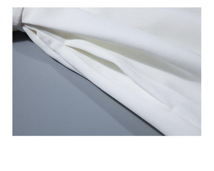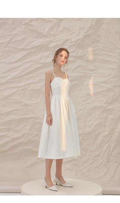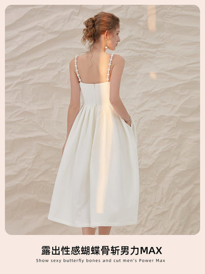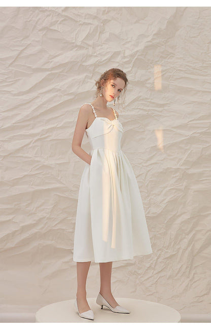 Introducing the epitome of elegance and sophistication - the Luxury French Retro Elegant White Midi Wedding Texture Backless Dress by Stila.