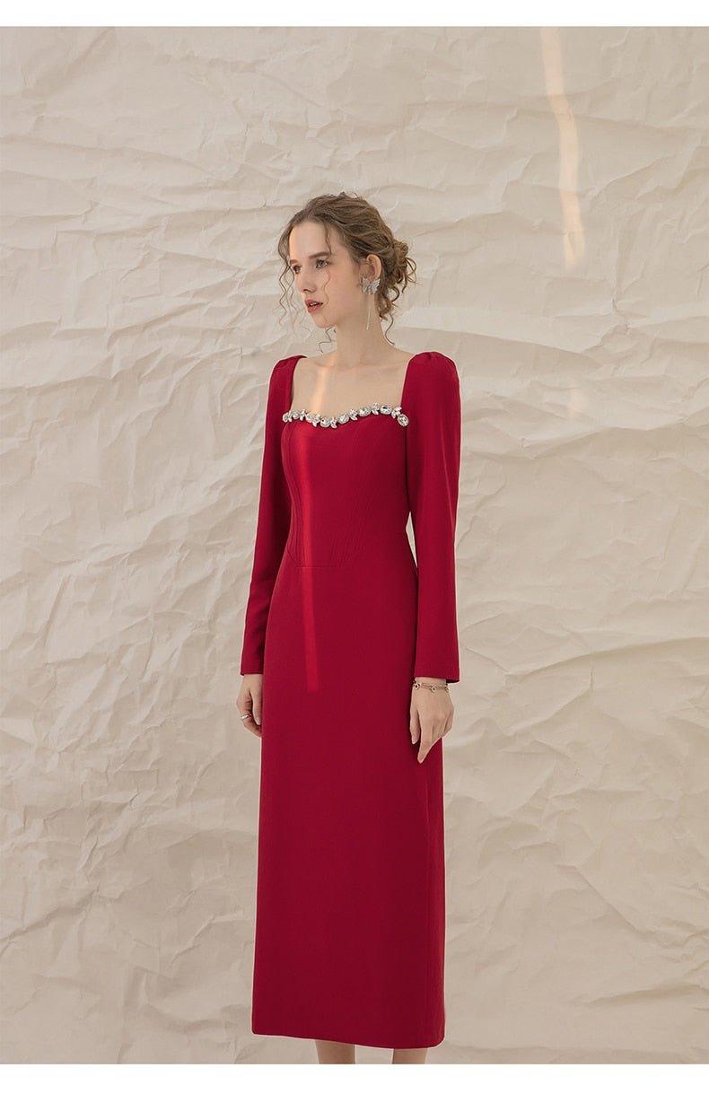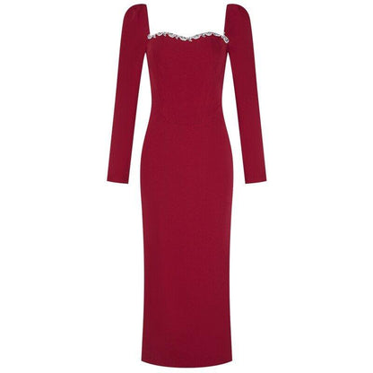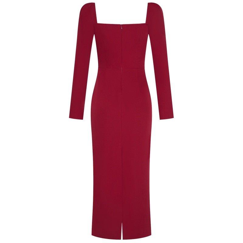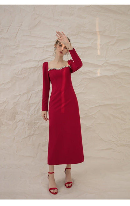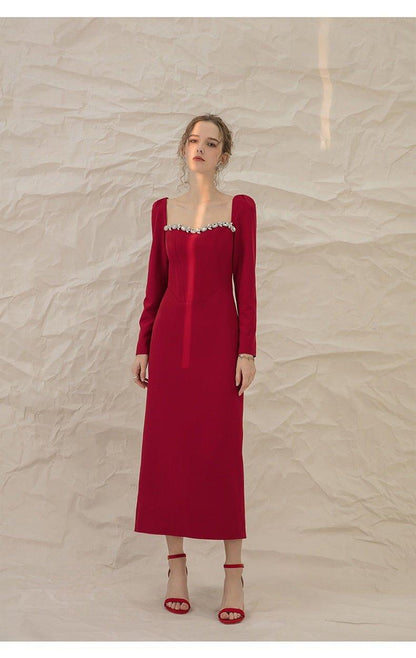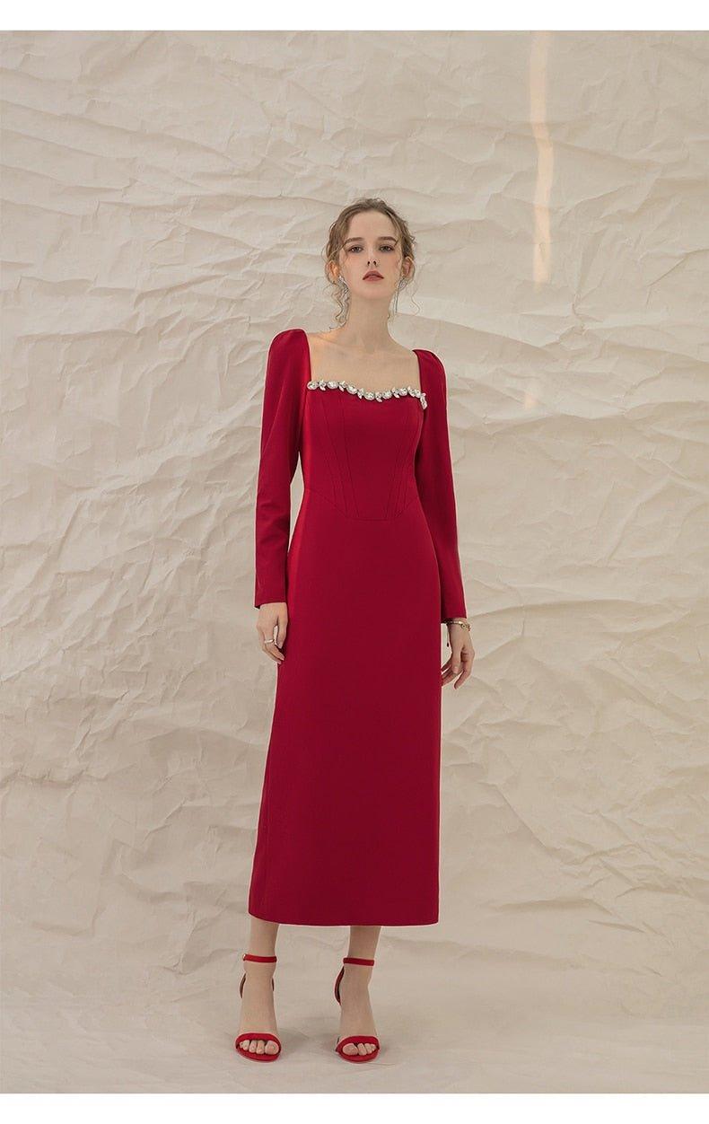 Luxury Red Elegant Square Collar long Sleeve midi pencil dress - Juika