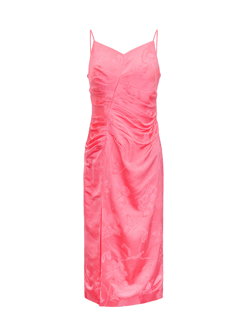 This M essential Mackay designer piece features a striking lotus petal red jacquard fabric, expertly crafted into a tether folded loose shirt. The design incorporates a pink long sleeve with a V-neck silhouette, complemented by a slit strapless dress underneath. The ensemble is elevated by wrap detailing on the jacket, accented with ropes for a sophisticated, textured finish. Perfect for those seeking a refined yet bold statement in their wardrobe.