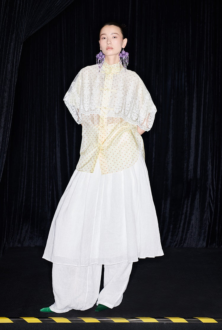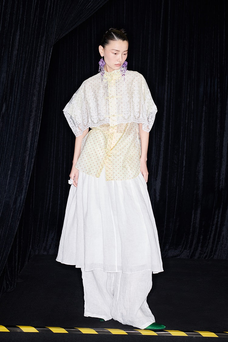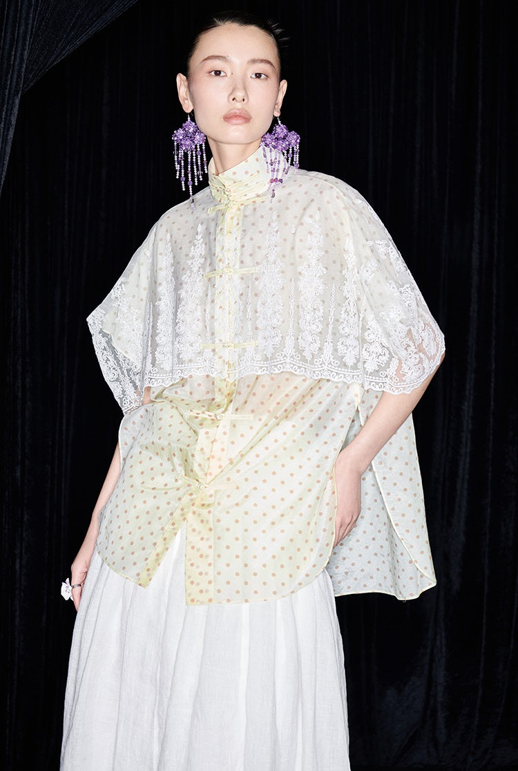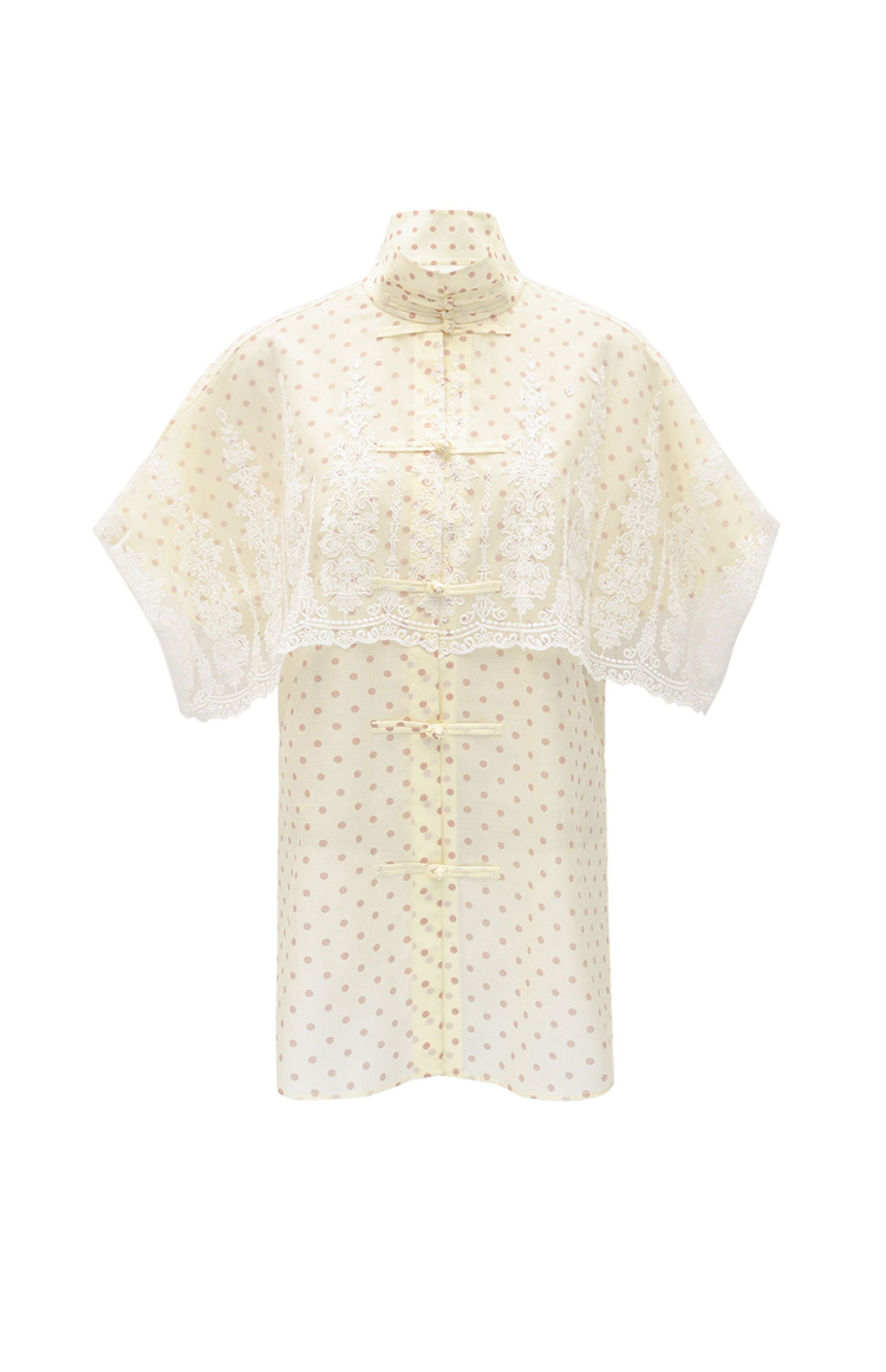 This M essential Mackay short-sleeved shirt features a refined blend of silk and cotton in a timeless polka dot pattern. It is designed with a classic collared neck and delicate lace trims on the cape, adding subtle elegance. The lightweight fabric ensures comfort and breathability, making it an ideal choice for polished, warm-weather dressing.