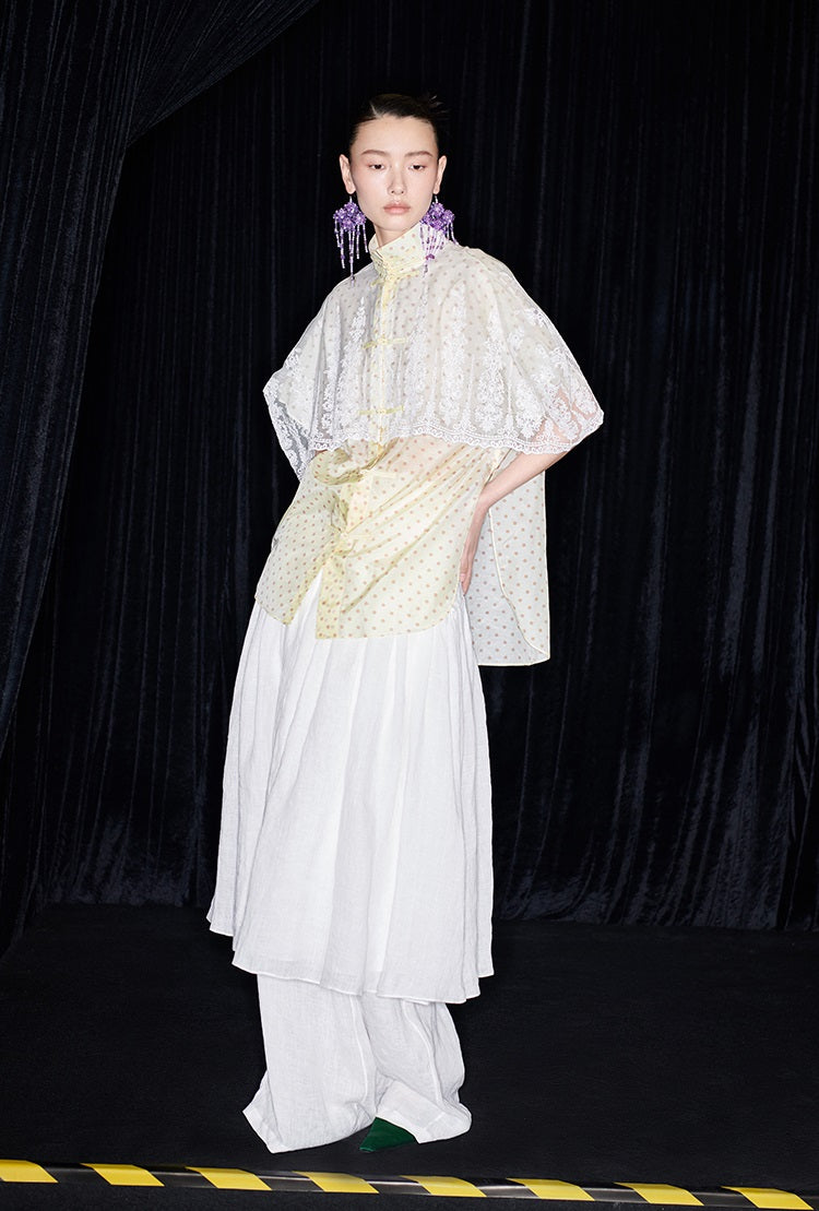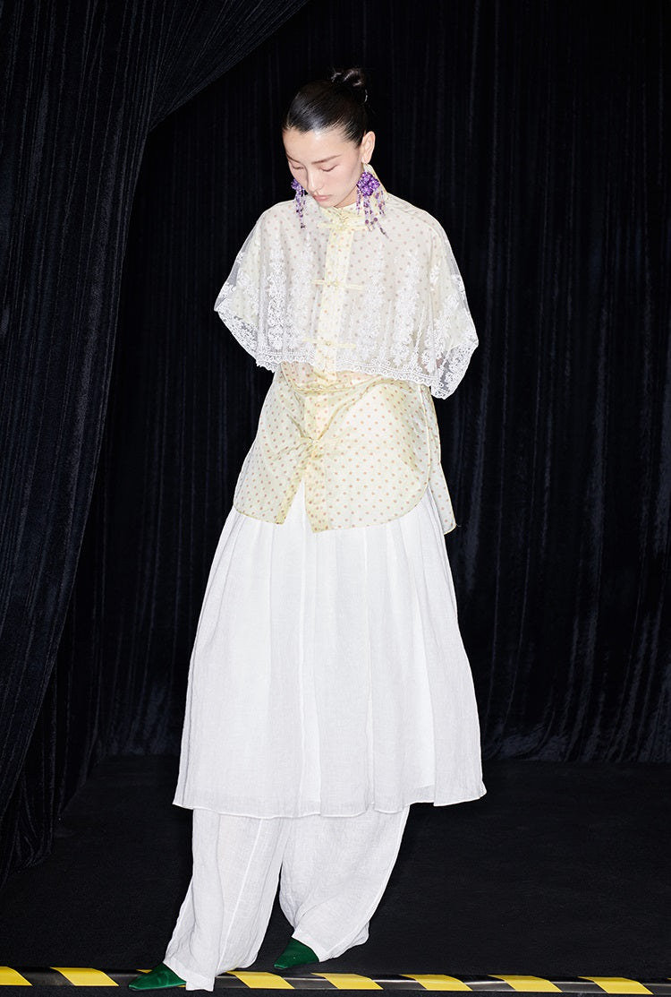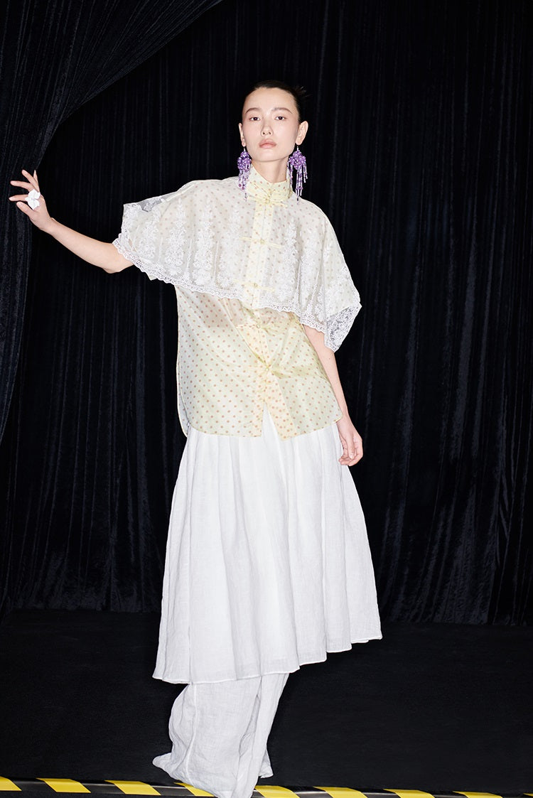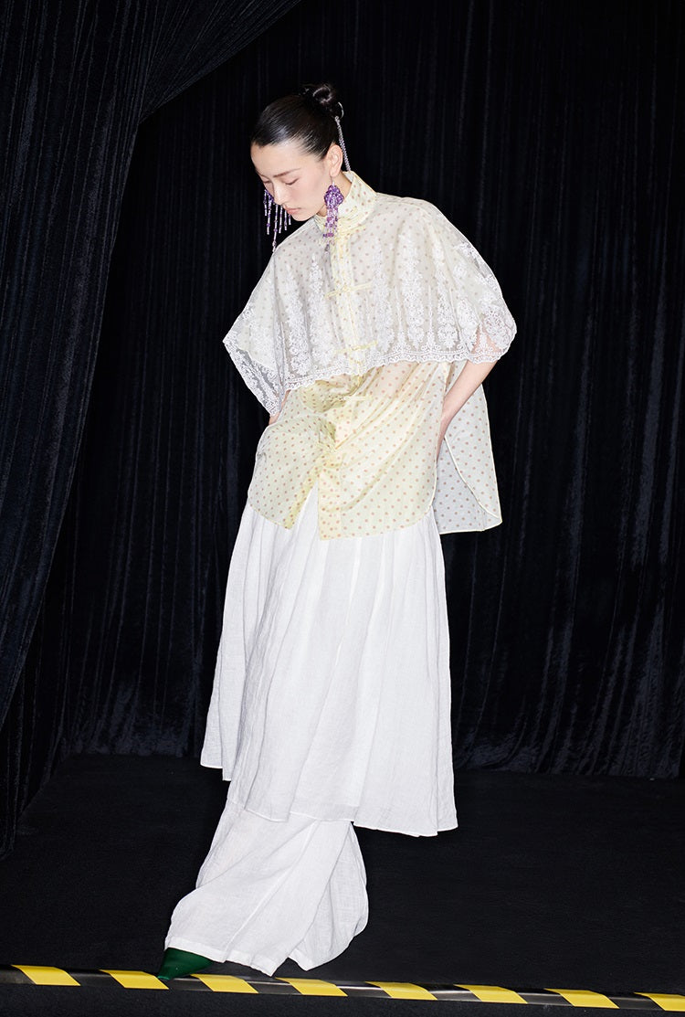 This M essential Mackay short-sleeved shirt features a refined blend of silk and cotton in a timeless polka dot pattern. It is designed with a classic collared neck and delicate lace trims on the cape, adding subtle elegance. The lightweight fabric ensures comfort and breathability, making it an ideal choice for polished, warm-weather dressing.