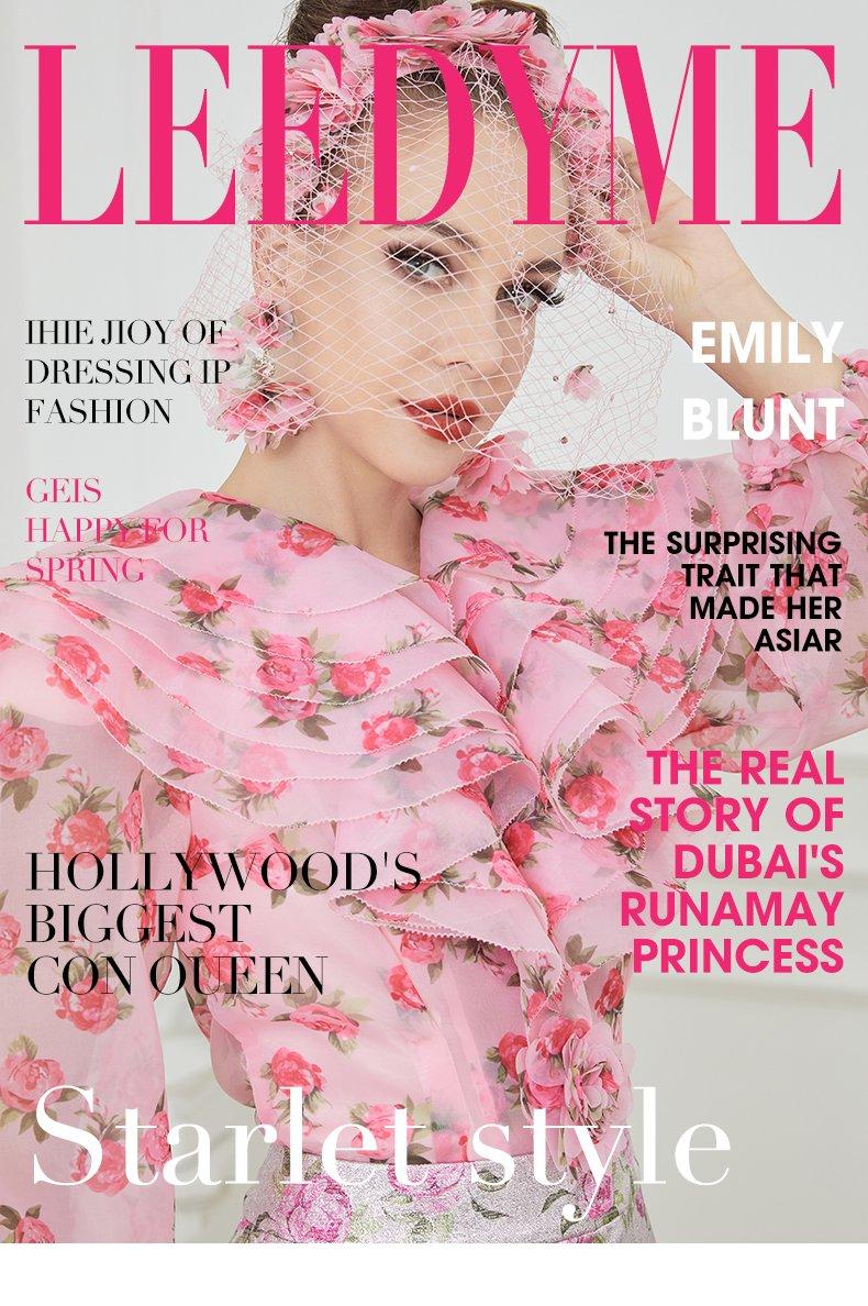 Pink Printed ruffle deep V-neck handmade flower slim suit - Bey