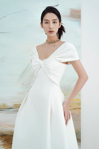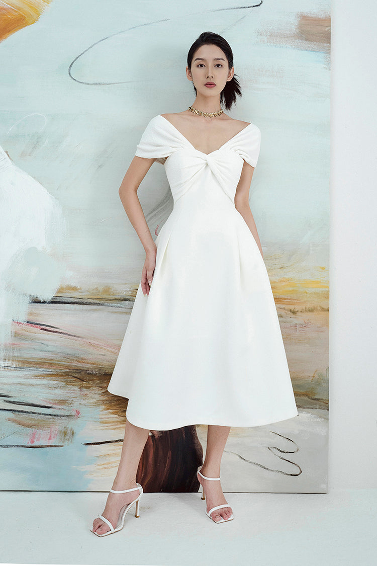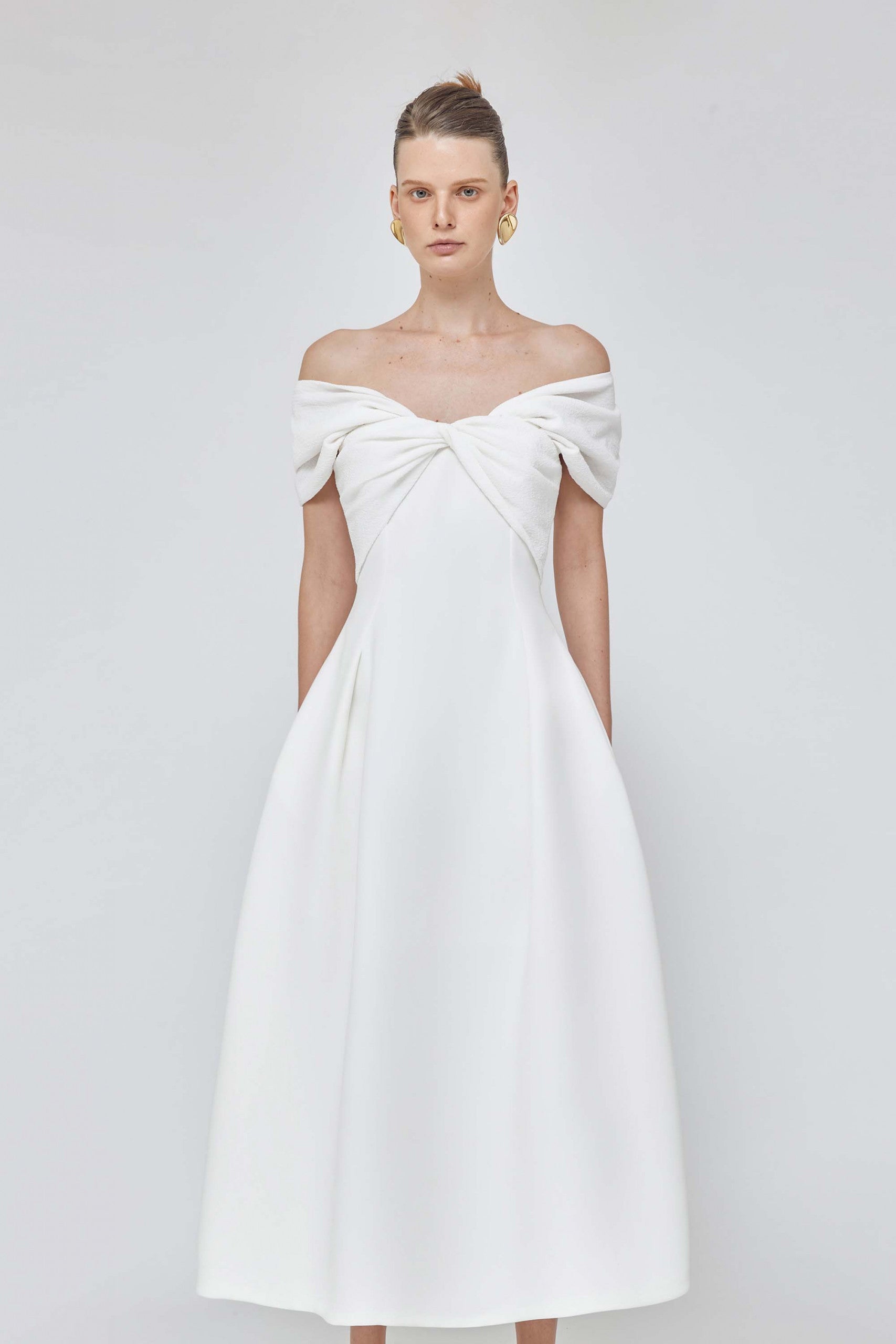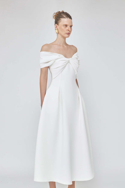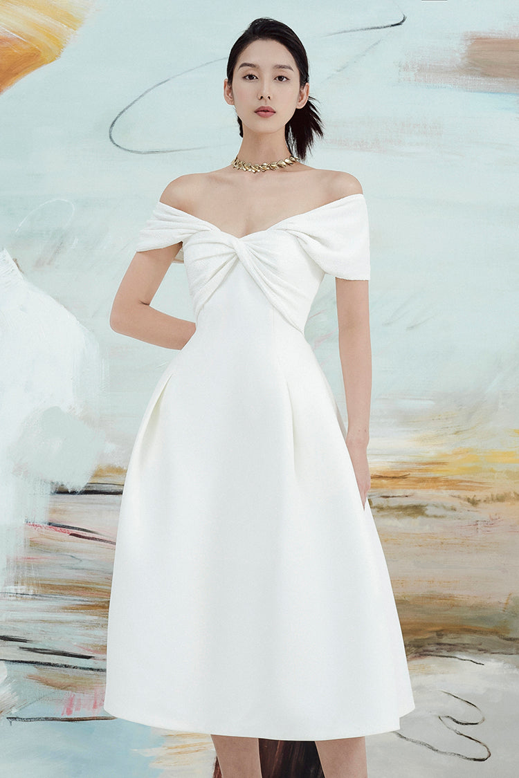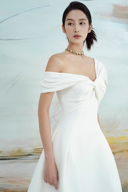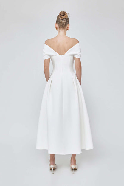 Pleated sleeve off shoulder white midi bridal dress - Calli