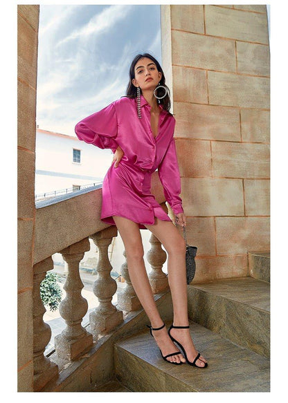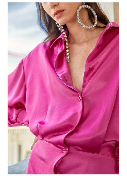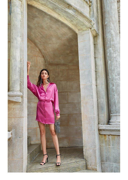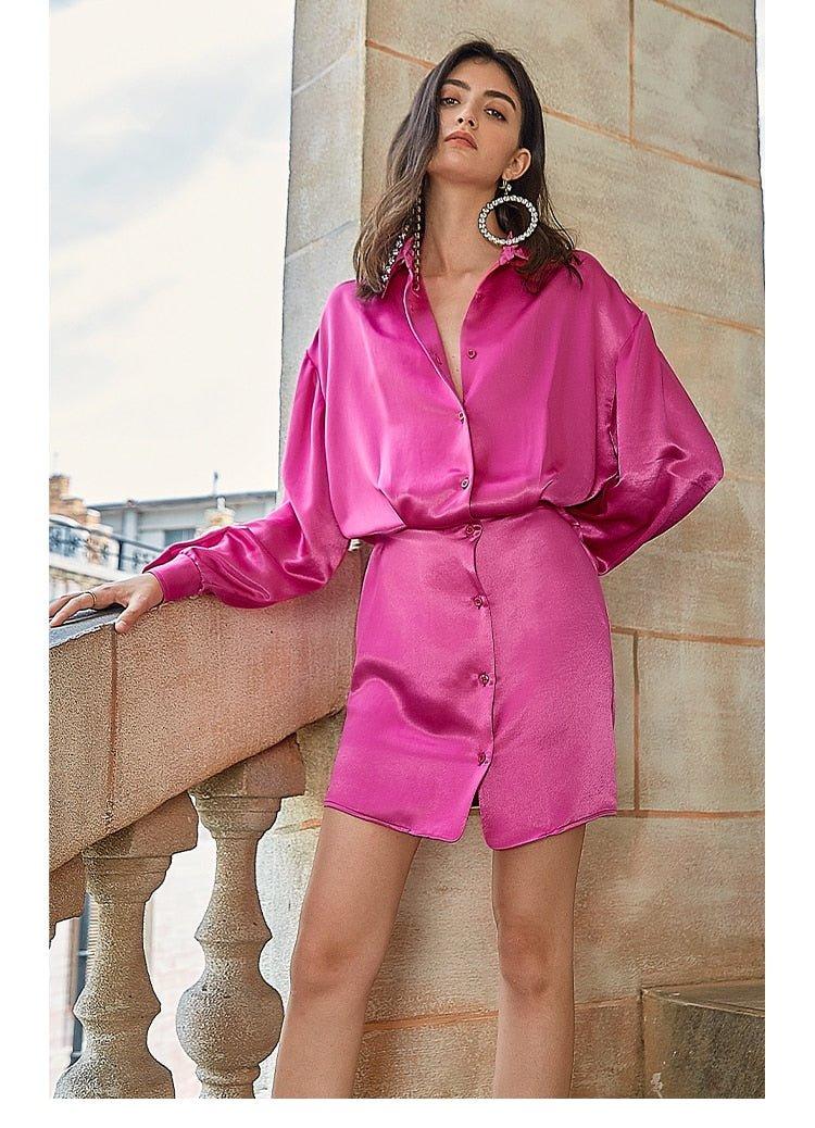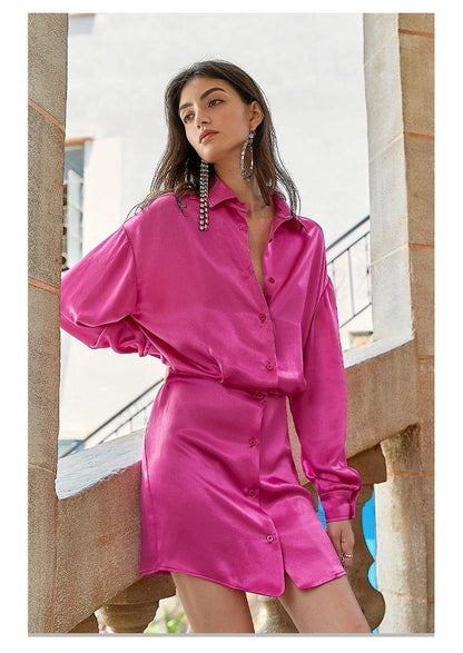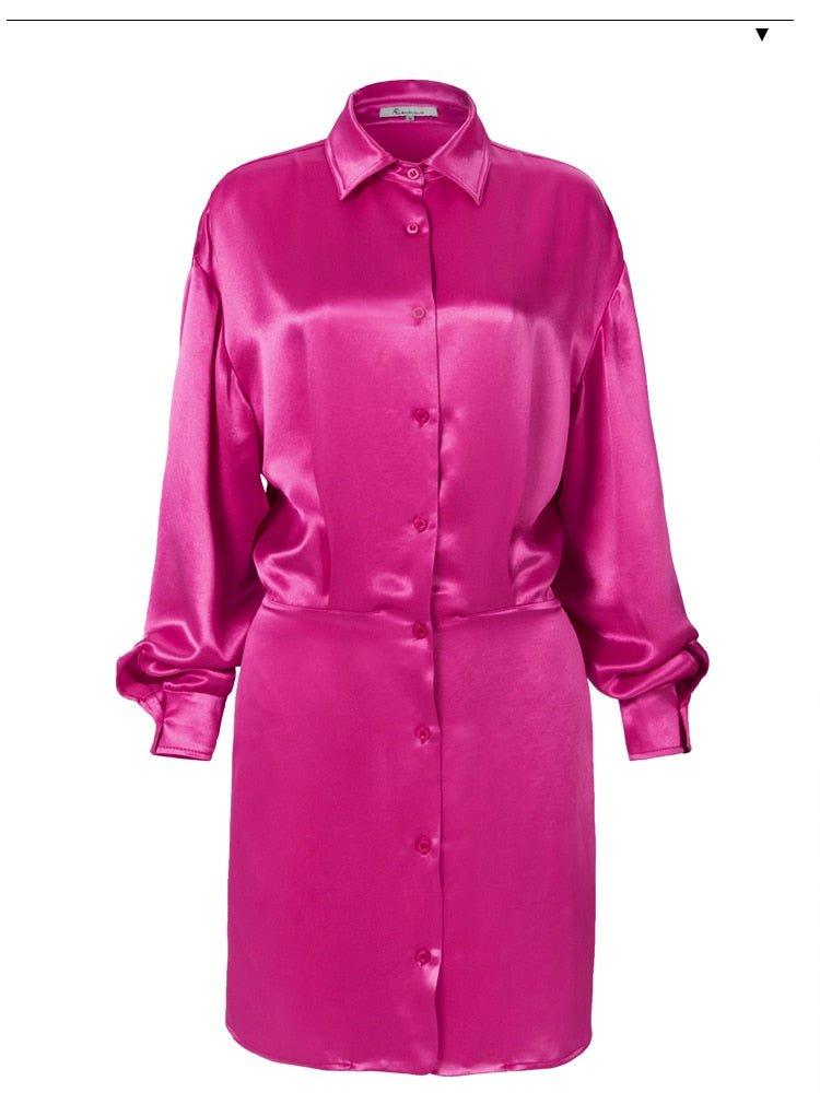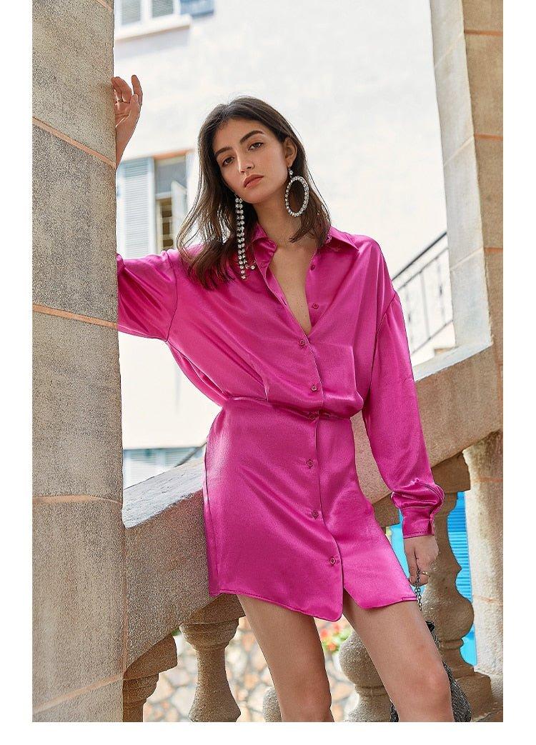 Spring summer silky satin mini rose pink colored office work date shirt dress - bulre