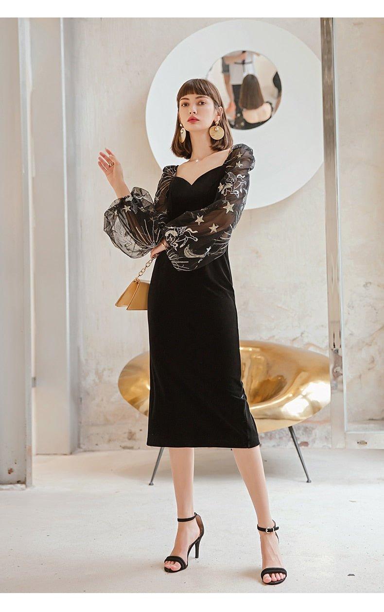 The luxurious velvet fabric drapes beautifully, enhancing your silhouette and adding a touch of opulence to your look. The deep V-neckline adds a hint of allure, while the lantern sleeves create a romantic and whimsical feel.