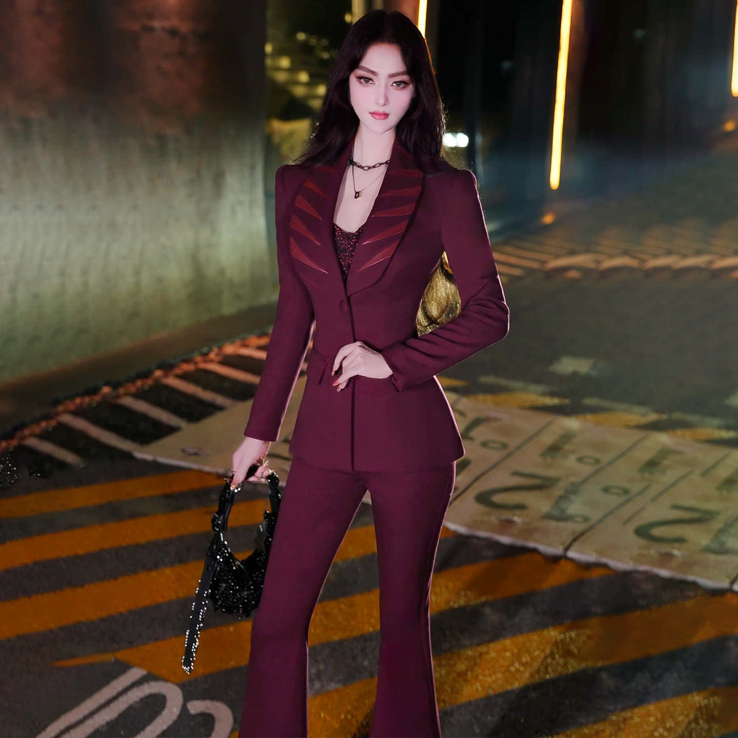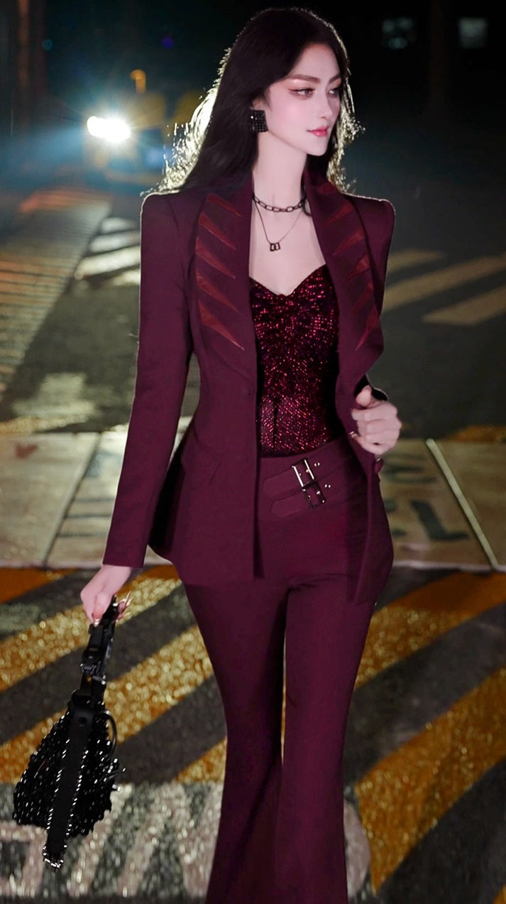 VJE Burgundy Spliced Small Pants Two-Piece Set Suit Elevate your wardrobe with this refined burgundy two-piece suit, expertly crafted with sophisticated spliced detailing. The tailored small pants offer a sleek silhouette that transitions seamlessly from boardroom to evening occasions. Rich burgundy tones convey confidence and elegance, while the coordinated set design ensures effortless styling. Perfect for the discerning woman who values polished, contemporary fashion that makes a statement without compromise.