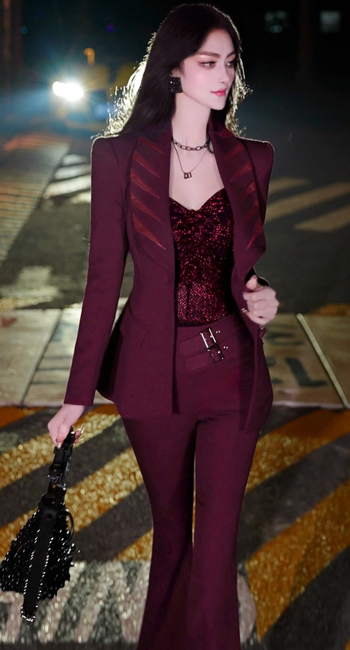 Serve up serious style with this burgundy spliced two-piece set that's giving power move energy. The tailored small pants paired with a coordinating top create an effortlessly chic look that transitions from boardroom to brunch without breaking a sweat. Mix, match, or wear together—this set is your new go-to for looking put-together when you want to feel unstoppable. Because looking good is the best revenge.